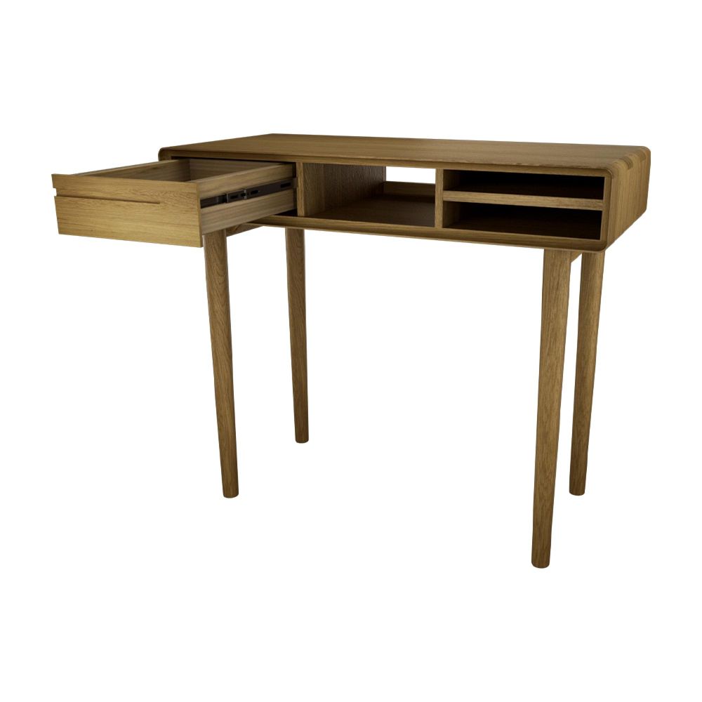 This desk features a drawer and open shelf space, giving you handy storage for office essentials like stationery, documents, or tech accessories. Its clean lines, tapered legs, and integrated groove handles reflect classic Scandinavian design, creating a piece that’s both elegant and functional.