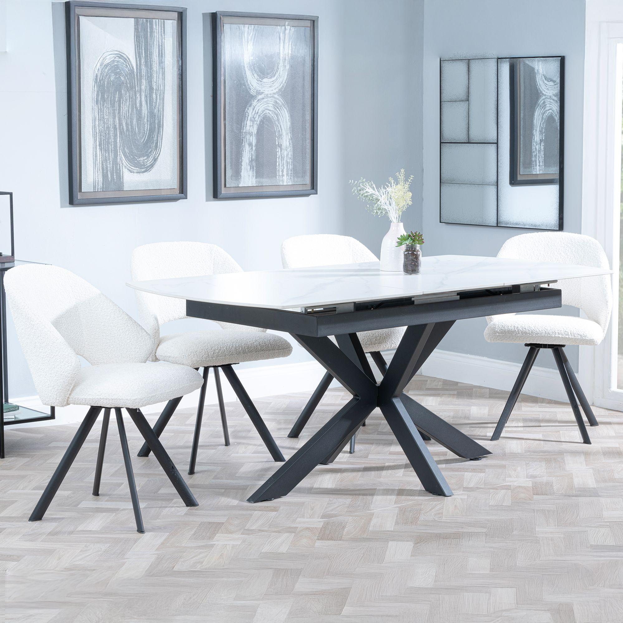 Take a look at the Bari Matt White Ceramic Top Extending Dining Table by Humz: this is chic, versatile, and is sure to decorate your dining room with beautiful style. This gorgeous table features a matt white Ceramic top in a 12mm thickness for added durability and style. The table will extend easily from 140cm to 180cm with two middle extension panels, accommodating up to 8 guests during larger gatherings. When closed, it can seat 4 comfortably, so ideal for everyday meals. The striking black spider legs add striking modern contrast to the white top. Adding sophistication to any room with dimensions 140cm x 90cm x 75cm closed and 180cm x 90cm x 75cm extended. Its sleek, modern design gives it a simplistic, practical approach to improving home decor.