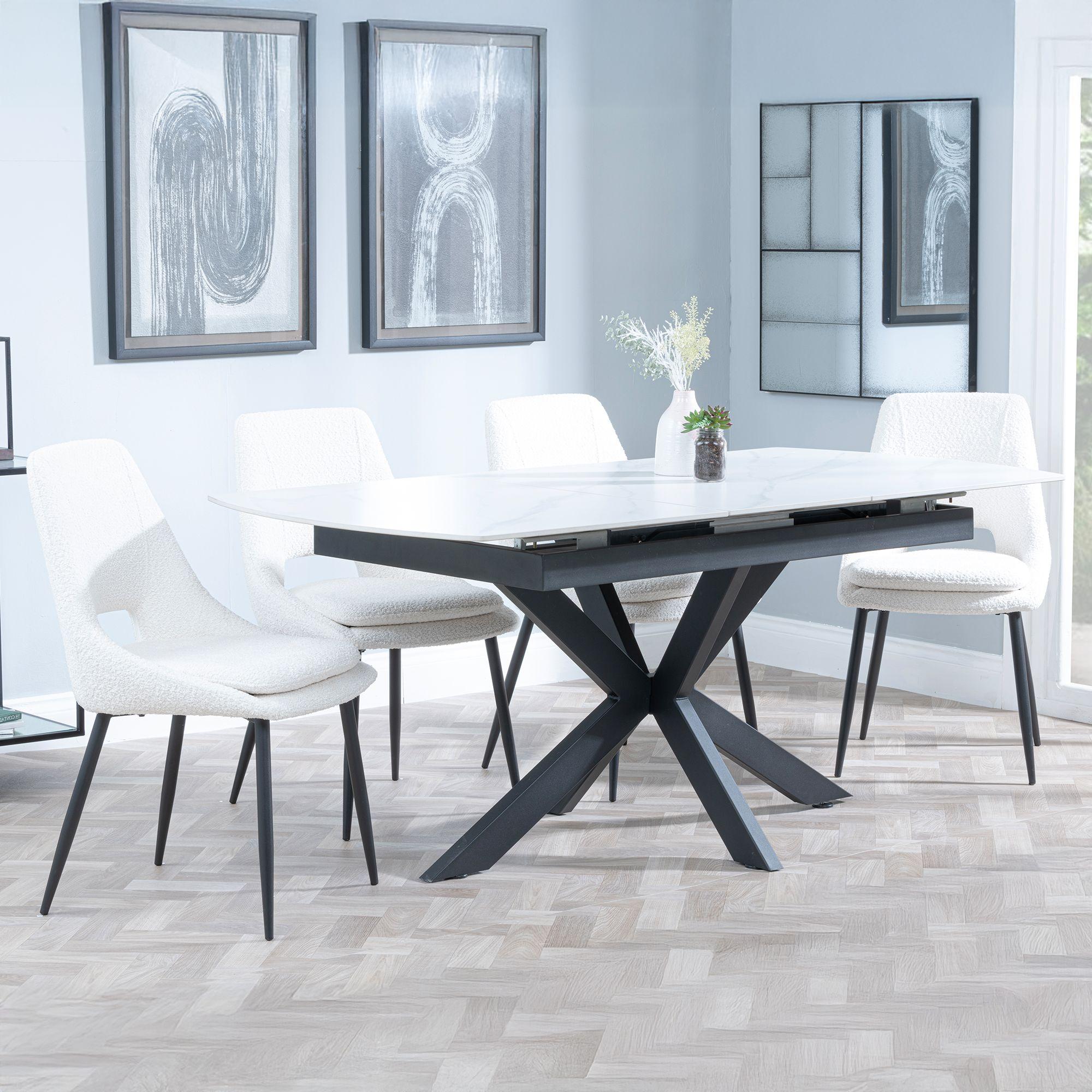 Take a look at the Bari Matt White Ceramic Top Extending Dining Table by Humz: this is chic, versatile, and is sure to decorate your dining room with beautiful style. This gorgeous table features a matt white Ceramic top in a 12mm thickness for added durability and style. The table will extend easily from 140cm to 180cm with two middle extension panels, accommodating up to 8 guests during larger gatherings. When closed, it can seat 4 comfortably, so ideal for everyday meals. The striking black spider legs add striking modern contrast to the white top. Adding sophistication to any room with dimensions 140cm x 90cm x 75cm closed and 180cm x 90cm x 75cm extended. Its sleek, modern design gives it a simplistic, practical approach to improving home decor.