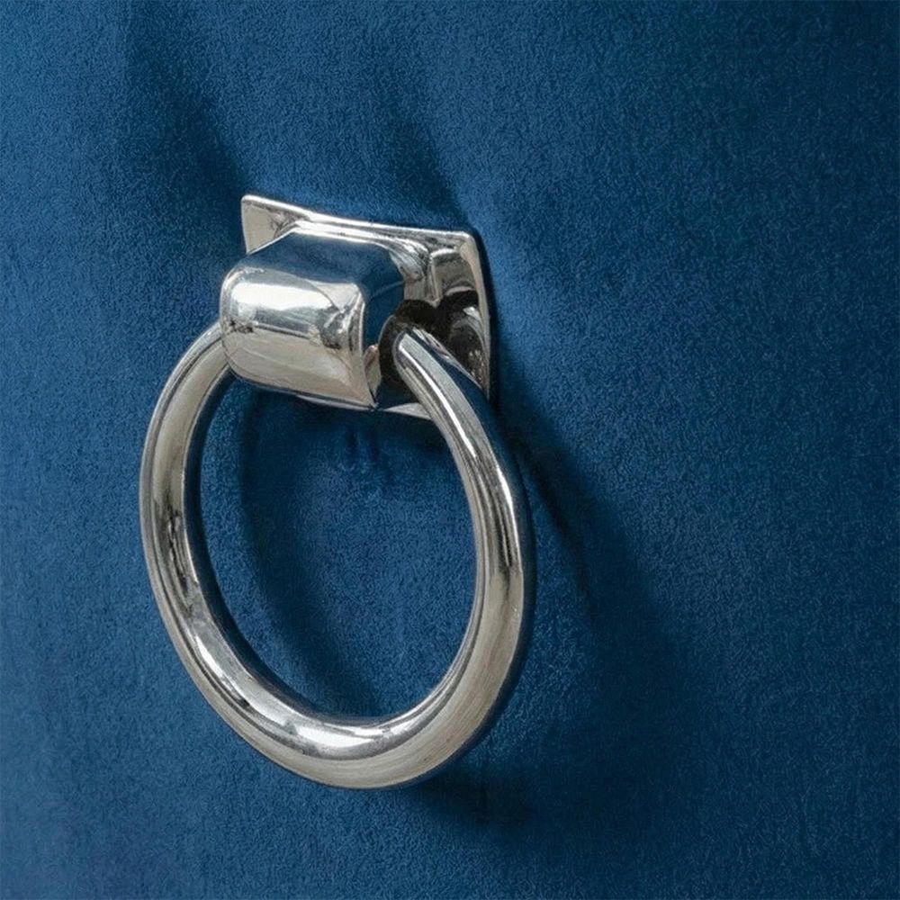 The chair features a distinctive diamond-tufted back with meticulous button stitching, creating a refined look. Complementing this, the striking silver stud detailing of the nail-head trim accentuates its graceful lines. The soft velvet upholstery in a captivating blue hue provides an inviting feel, while the ergonomic scooped back and curved backrest offer superior support and ensure a comfortable dining experience for hours. A unique knocker handle detail on the back adds a touch of classic sophistication.