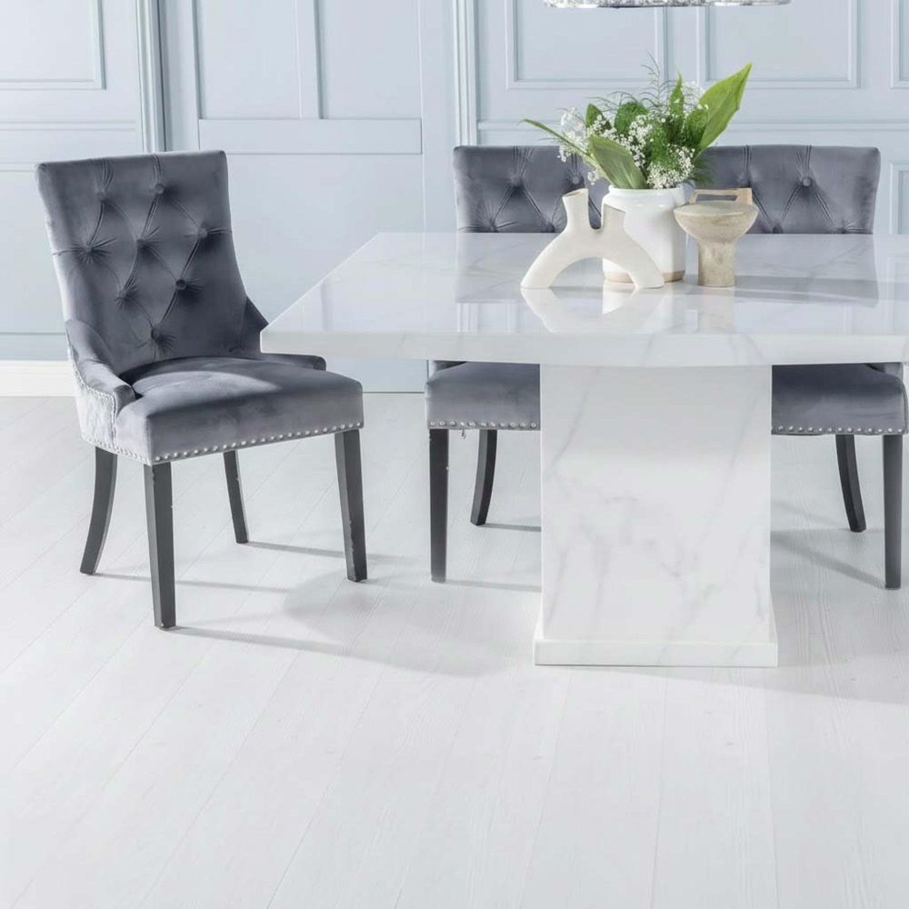 Turin Dining Set - 8 Seater - 140cm - Square - White Marble - Knocker Back Dining Chairs - Grey Fabric - Black Legs