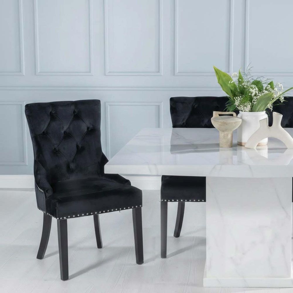 Turin Dining Set - 8 Seater - 140cm - Square - White Marble - Lion Head Ring Back Dining Chairs - Black Fabric - Black Legs