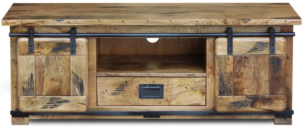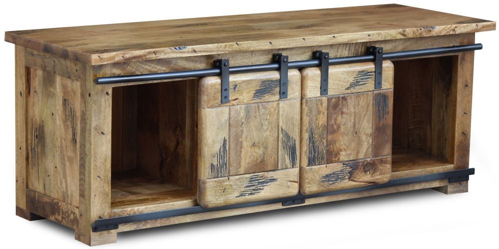Item Code: R007 Please Note that there will be a slight variation between the actual colour and design, and the representation on our website. Actual product color may vary from the images shown. In addition, please be aware that colours and finishes often vary between different batches.Iron Works storage and media solutions, made from solid mango wood, with a natural finish and distressed highlights.