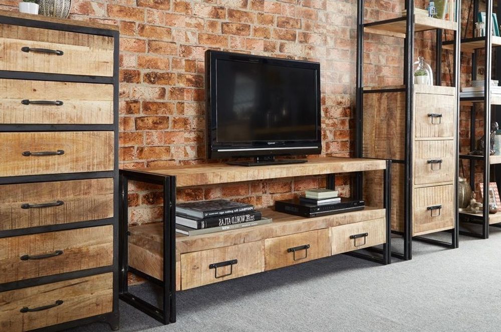 Item Code: ID22 Industrial Large Tv stand featuring wood and Metal and 3 generous drawers The Light grain Hardwood Left in its Natural state and colour with natural variations and slight cracking with a banded iron edges.Made from reclaimed metal and wood, this Industrial Vintage Large Tv stand will complement any surroundings.Please Note : The Indian Hub Bhuj Industrial range is Hand made due to which all pieces have their own individual character, including some irregularities, which makes each piece unique.