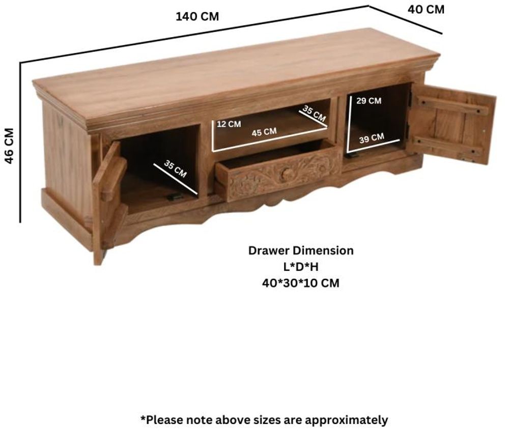 Item Code: MC02 This TV cabinet with intricate Carved front detail will give a stunning focal point to your room along with offering generous storage space for your television and electrical equipment. Hide any clutter including remotes, games controllers etc within the cupboards and drawer. The open shelf is ideal for gaming / media equipment. The beauty of this item will fit perfectly into any existing decor and can be displayed alone or in addition to other items from this range. Made entirely using 100% Eco sourced solid natural wood by skilled craftsmen in India. This range is finished in a light whitewash for a distressed look.