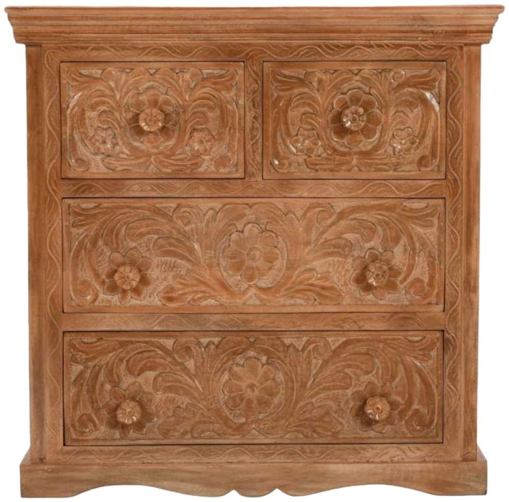 Item Code: MC09 The intricate hand carved Carved detailing on this chest of drawers makes this item a real eye-catcher and will add a touch of elegance to your home. Featuring 2 large drawers and 2 smaller ones there is plenty of storage space available for anything you choose to use it for. Will be great in the bedroom or equally suitable for the lounge. Display lamps, photos or any other accessories to the top of the unit to add to the beauty of this item. Handmade entirely using 100% Eco sourced solid natural wood by skilled craftsmen in India. This range is finished in a light whitewash for a distressed look.