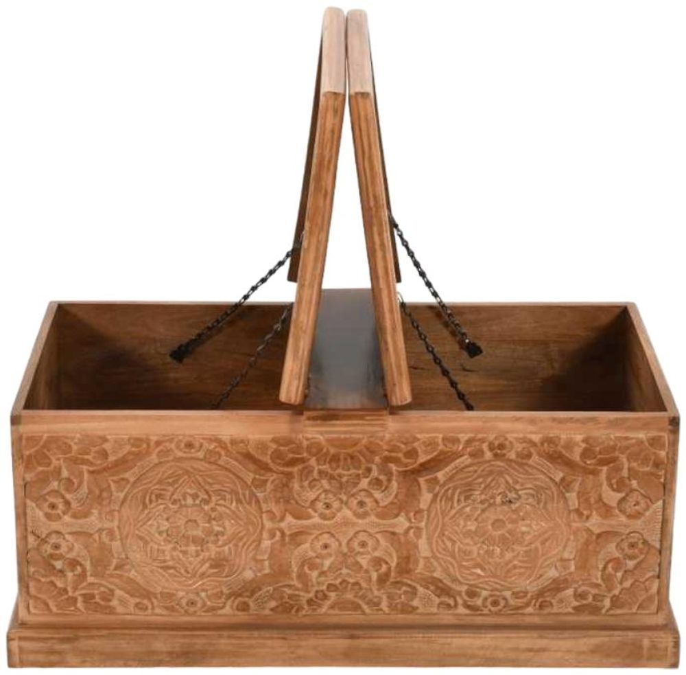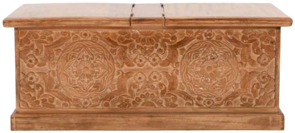 Item Code: MC06 This is probably one of our most versatile items in this range. Suitable as a blanket box, coffee table, toy box.the possibilities are endless. Featuring 2 opening lids which are secured by chains there is a vast amount of space for you to utilize according to your needs. Made entirely using 100% Eco sourced solid natural wood by skilled craftsmen in India. This range is finished in a light whitewash for a distressed look which enhances the beautiful carving detail surrounding this item.