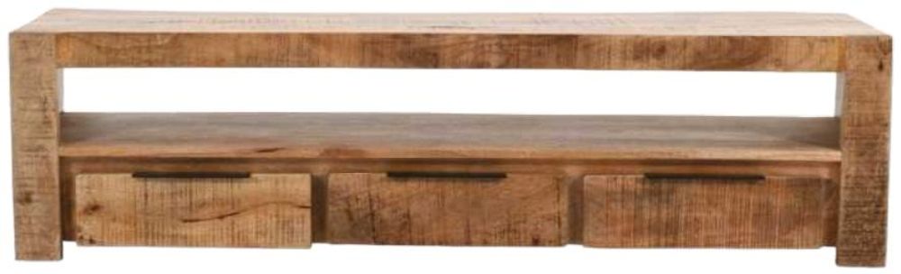 Item Code: MD02 This large TV cabinet with 3 good sized drawers will give a stunning focal point to your room along with offering generous storage space for most sizes of television and electrical equipment. Hide any clutter including remotes, games controllers etc within the drawers. The open shelf is ideal for gaming / media equipment. The beauty of this item will fit perfectly into any existing decor and can be displayed alone or in addition to other items from our Dispur range. The rough sawn laquered finish is both rustic and modern, highlighting the natural beauty of the wood with a handmade unique look and feel. Made entirely using 100% Eco sourced solid natural wood by skilled craftsmen in India.
