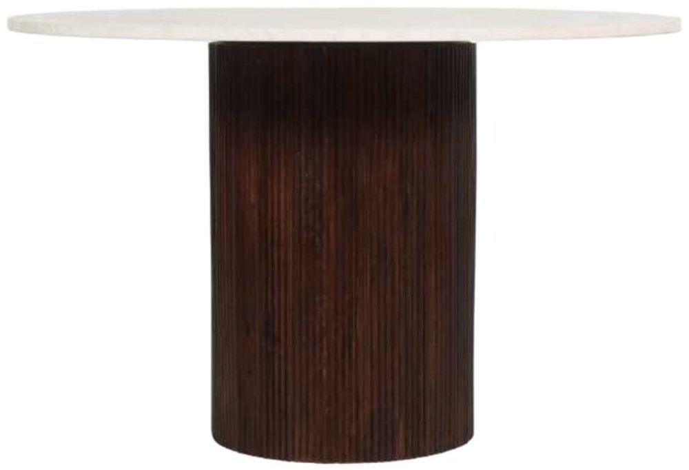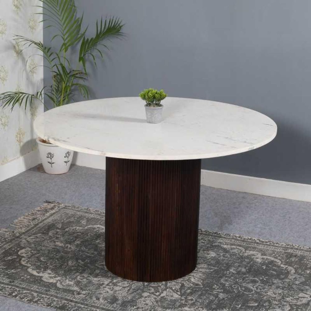Item Code: MT08 This round dining table is the smaller version in this range and has the matching coffee table available which would be perfect for a lounge / diner. The stunning simplicity of the natural marble with the fluted wooden pedestal are exquisite and will certainly be a statement piece in your home. Completely handmade by our skilled craftsmen in India using eco friendly materials. Made from 100% mango wood and natural marble.