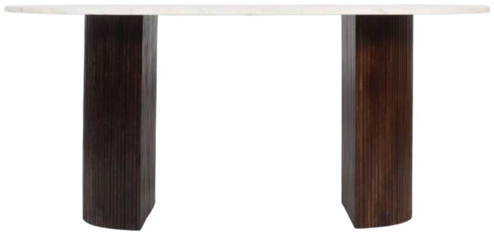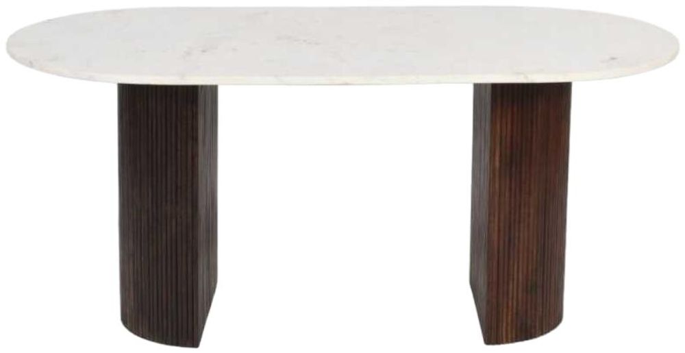 Item Code: MT07 This is the larger dining table in our Fluted range and will look stunning when holding any dinner parties / special events. The beautiful simplicity of the natural marble with the fluted wooden supports are exquisite and will certainly be a statement piece in your home. Completely handmade by our skilled craftsmen in India using eco friendly materials. Made from 100% mango wood and natural marble.