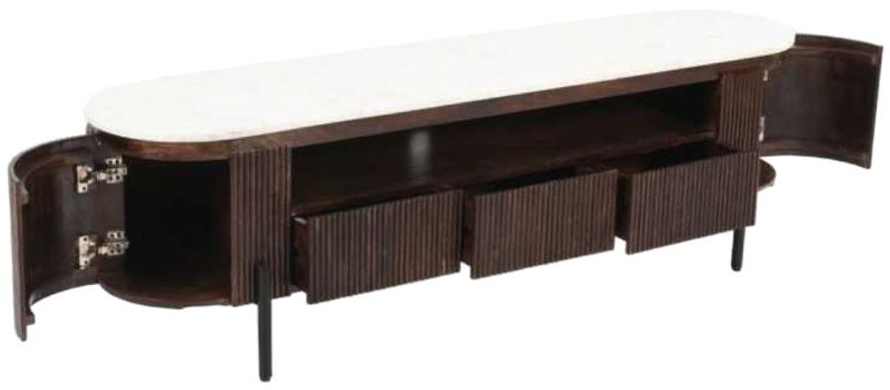 Item Code: MT16 This dark mango tv stand is designed to hold a larger tv and is wider than the alternative smaller version in this range. The beautifully crafted rounded edges and the elegant marble top will stand the test of time whilst the artwork fluted mango wood surround compliments it perfectly. Features include 2 cupboards, 3 good sized drawers to store all your remotes, game controllers whilst not in use, and an open shelf. The open shelf is ideal for any gaming / media equipment you may have. Sturdy metal legs complete the look of this item which is completely handmade by our skilled craftsmen in India using eco friendly materials. Made from 100% mango wood and natural marble each piece is individual and unique.
