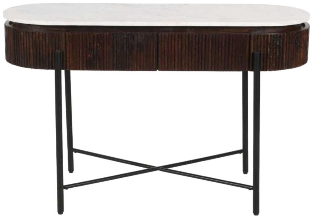Item Code: MT09 A console table that will stand out in any room of the house. Designed with rounded edges the elegant marble top will stand the test of time whilst the artwork fluted mango wood surround compliments it perfectly. Featuring 2 drawers you can utilize the handy storage space and dress the item with any photos, flowers, lamps that you want to showcase. Sturdy metal legs complete the look of this item which is completely handmade by our skilled craftsmen in India using eco friendly materials. Made from 100% mango wood and natural marble each piece is individual and unique.
