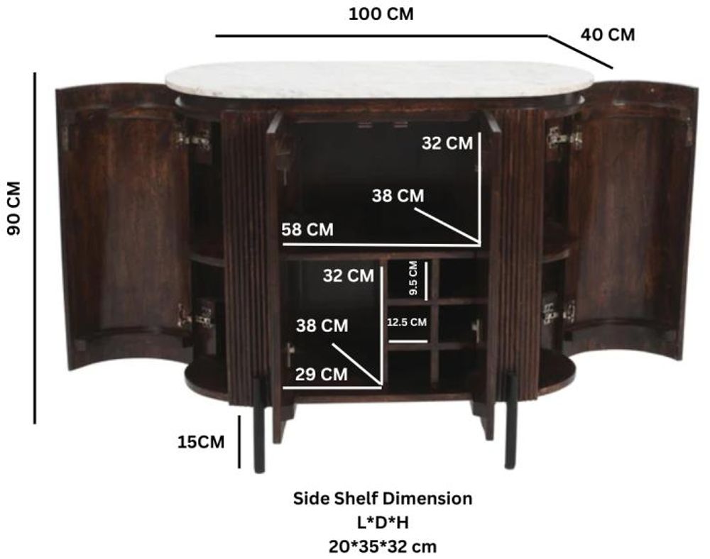 Item Code: MT05 The sleek and stylish design of this sideboard / drinks cabinet hide a multitude of storage behind the doors. Featuring 4 doors there is ample shelving available for drinks bottles and glasses, or double as a sideboard for books / games etc. The elegant marble top will stand the test of time and the Artwork fluted mango wood surround compliments it perfectly. Sturdy metal legs complete the look of this item which is completely handmade by our skilled craftsmen in India using eco friendly materials. It is a beautiful piece of furniture for any room in your home.