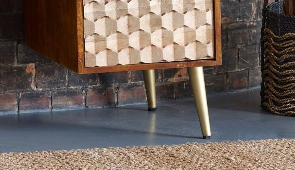 Item Code: CN08 This beautiful, unique range complemented with Scandinavian inspired legs is the perfect choice for a modern retro interior, in combination with other items in the same collection. It will add warmth to your home with its two-tone colour and metal gold legs.The Imphal Desk items offers 1 open shelf, 1 drawer and 1 door with an internal shelf, with a pre-cut hole for cable management.. The unit features CNC cuts on the front of the drawer and door, matching wooden handles and angled metal legs. The unit will come fully assembled, only the legs must be attached.