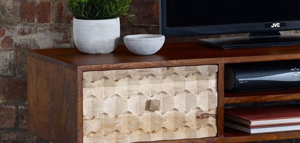 Item Code: CN04 This beautiful, unique range complemented with Scandinavian inspired legs is the perfect choice for a modern retro interior, in combination with other items in the same collection. It will add warmth to your home with its two-tone colour and metal gold legs.Large Plasma TV Stand with 2 Shelves in the centre and 2 Drawers on the sides, featuring CNC cuts on the front of each drawer, matching wooden handles and angled metal legs. The unit will come fully assembled, only the legs must be attached.
