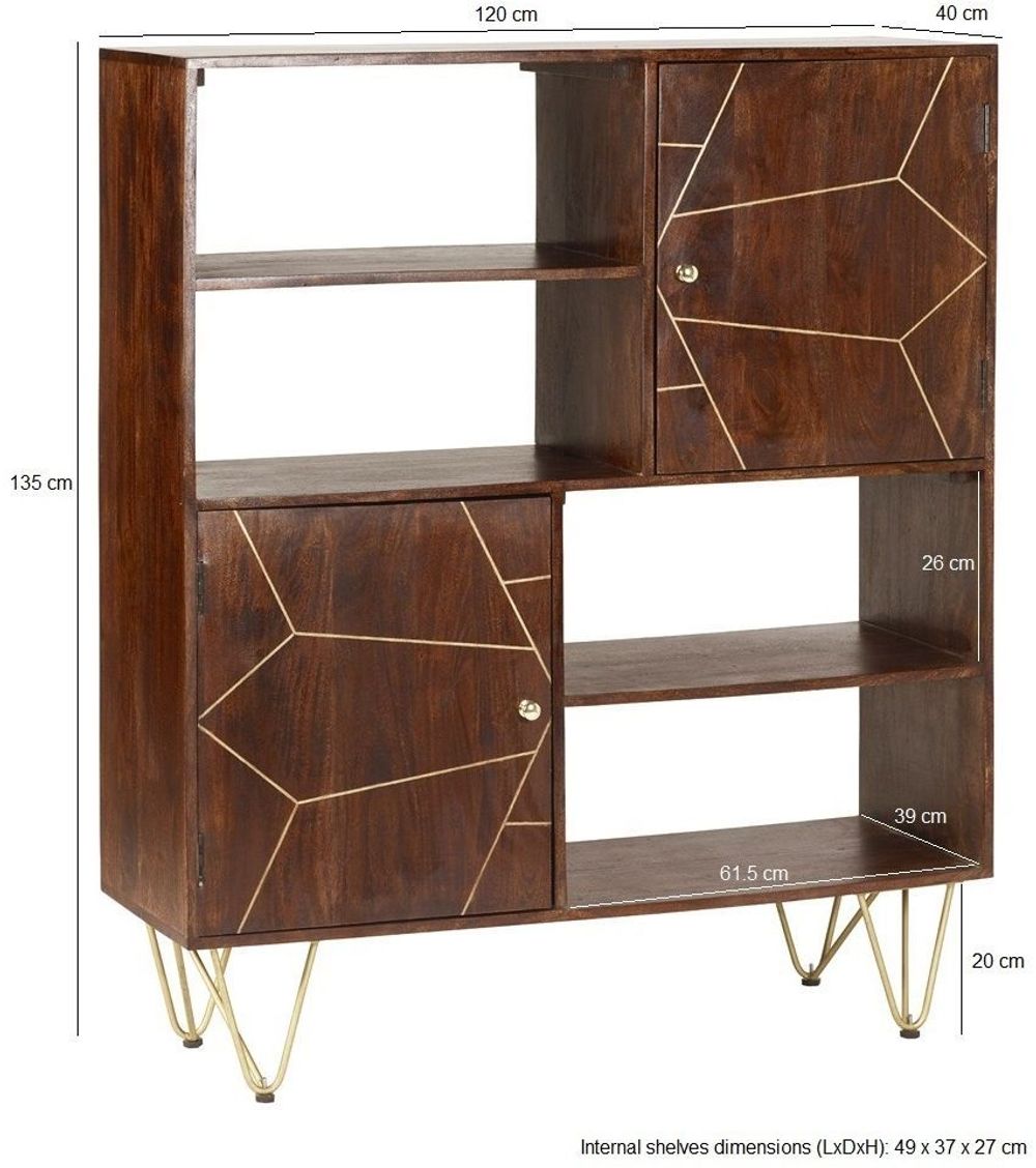 Item Code: BRS12 This modern contemporary style furniture combining metal inlay on solid wood creating an abstract style, is taking the furniture making to a whole new level. The angled legs made of metal adds to the retro vintage look.A lovely piece of furniture suitable both for the living room space as well as for an office, offering 4 open shelves for books, files, magazines, etc. and 2 cupboards, each one with an internal shelf for all kind of items you would like to hide away, This range is offered in a dark walnut finish, featuring gold metal inlays on the front of the unit.
