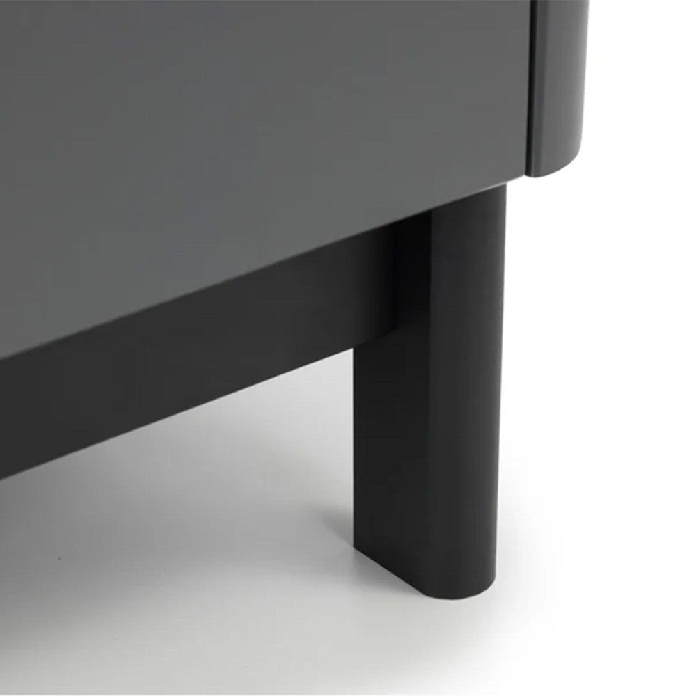 Item Code: CHL005 The Chloe Bedroom collection has a modern, retro style finished in a storm grey lacquer with satin black wooden legs and handles. The corners are rounded for a softer look, creating perfect balance between style and functionality. This wardrobe features a large hanging area behind 2 doors, along with a drawer for additional storage.