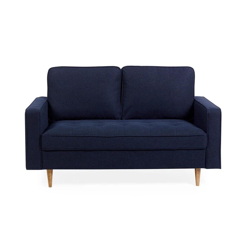 Item Code: HEN701 Sink into this compact 2 seater sofa, combining modern elegance and comfort. Upholstered in rich, deep blue linen fabric, perfect for adding a bold touch to your living room. Its clean-lined silhouette, padded, supported backrest cushions, and tufted, detailed seat provide all the comfort you need for everyday lounging. Complemented by slim wooden effect legs, adding the subtle hint of warmth and mid-century charm. Partial assembly required, just attach the legs.