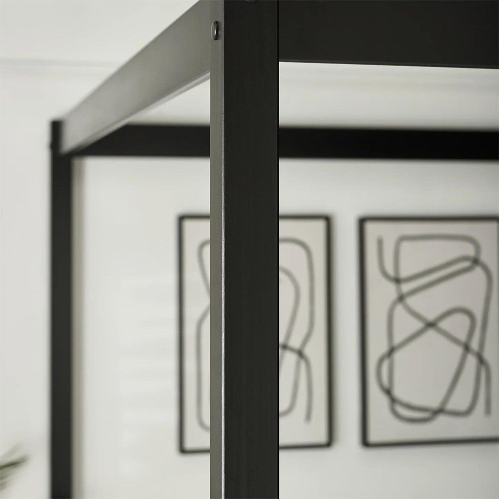 Item Code: ROX001 The Roxanne 4 Poster Bed delivers striking architectural presence with its clean lines and bold, structured frame. Defined by its tall, open canopy design, it creates a dramatic focal point while maintaining a refined aesthetic. Finished in a deep black tone, the streamlined silhouette brings contemporary edge to the bedroom. The elevated frame and minimalist headboard keep the look light and balanced, allowing styling from crisp white linens to layered textures to truly stand out. Confident and modern, the Roxanne 4 Poster Bed transforms the bedroom into a space that feels effortlessly sophisticated.