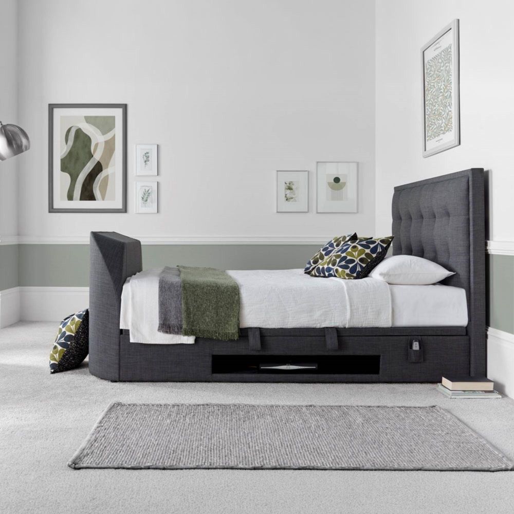Item Code: FALTV135SL Designed with a luxurious padded headend and an eye catching stylish shaped footend which cleverly conceals up to a 43" TV (depending on overall dimensions) which can be raised and lowered remotely giving a touch of luxury to your bedroom.The ample ottoman storage space conveniently hidden in the base of the bed adds a practical element for clutter free living. Made with quality fabrics and wood from sustainable sources.TV not included.Orders for next day deliveries must be received by 10am on the working day before delivery is required.