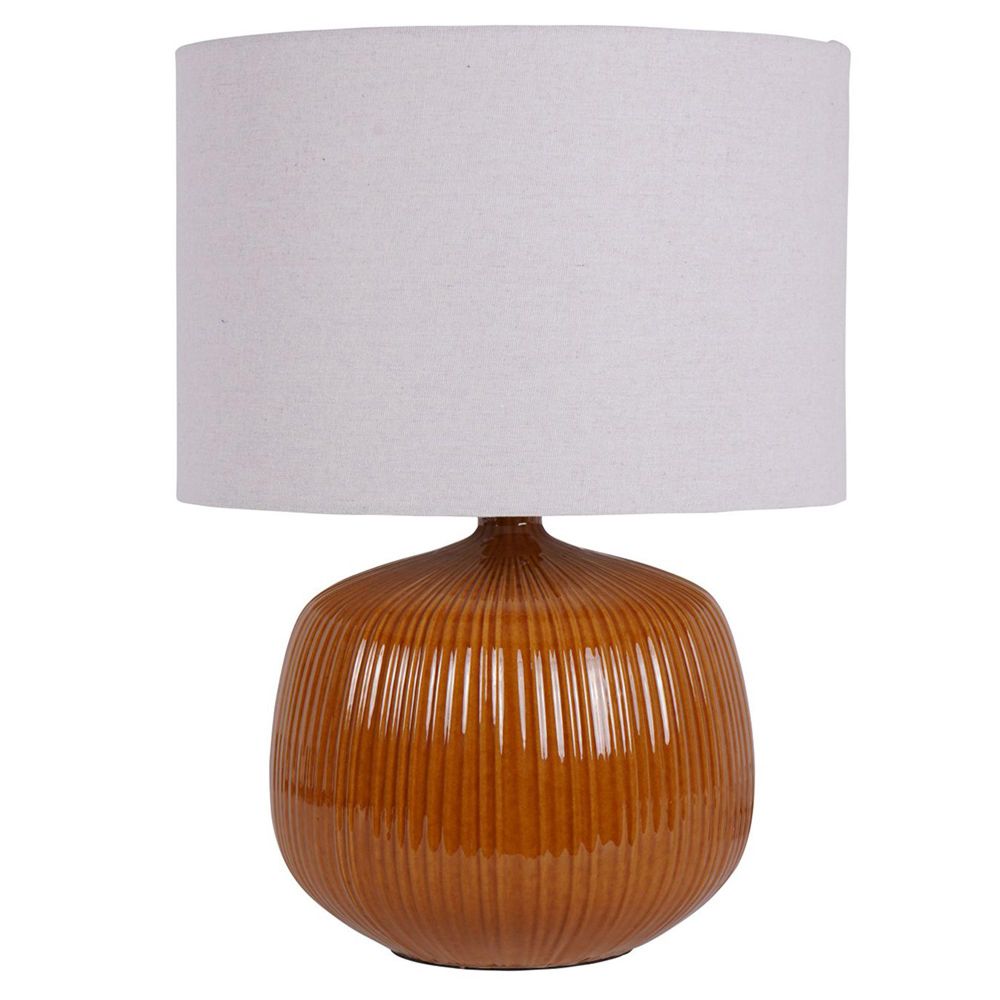 Item Code: 705991 Meet our Bruno Ceramic Table Lamp in Burnt Ochre, boasting a distinctive ribbed glaze texture that adds depth and character to any room. With its rich ochre brown colour, this lamp brings warmth and sophistication to your decor scheme. Elevate your space with the timeless elegance of our Bruno Ceramic Table Lamp, a perfect fusion of style and substance. Sold with Shade, Base dimensions only W25 x D25 x H32 Cable length 125cm. Switch type Standard Toggle SwitchFree Delivery