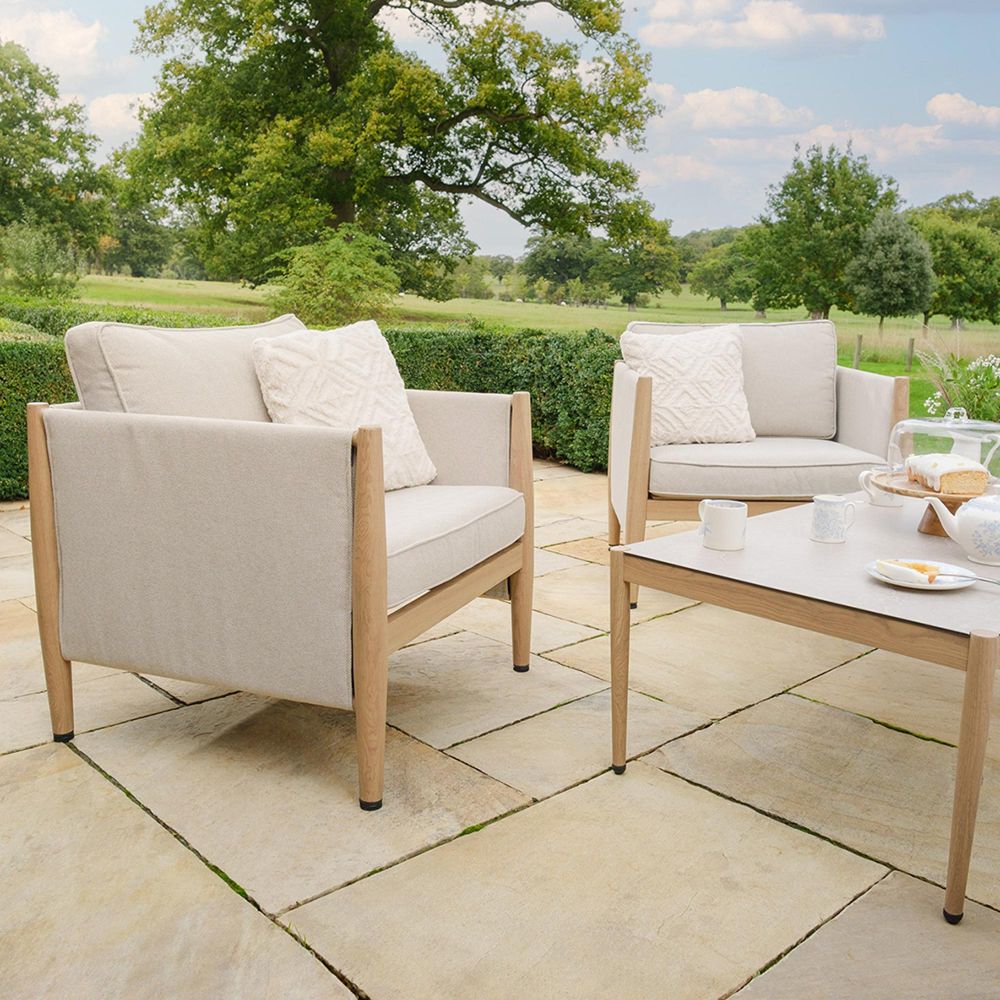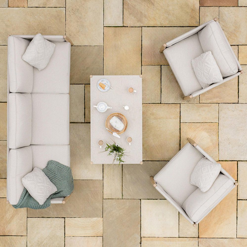 The Maze Burford 3 Seat Aluminium Sofa Set combines comfort, style, and durability for your outdoor space. Its powder-coated aluminium frame features a refined heat-transfer wood-effect finish, giving the warmth of timber with none of the maintenance. Deep SeasonSure cushions are shower-resistant and stain-resistant, providing long-lasting comfort for everyday use. The set includes a three-seat sofa, two armchairs, and a rectangular coffee table with a 5mm tempered ceramic-printed glass top, offering a practical and easy-to-clean surface for drinks, snacks, or d?cor. With its modern design and flexible seating, the Burford Sofa Set is perfect for relaxing, entertaining, or creating a stylish outdoor lounge area.