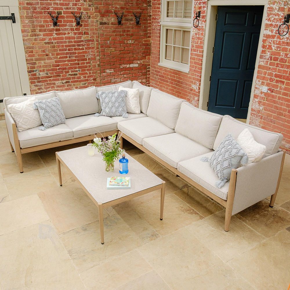 Transform your outdoor living area with the Maze Burford Large Aluminium Corner Sofa Set, designed to bring comfort, style, and durability together. The sleek aluminium frame is finished with an elegant heat-transfer wood effect, giving you the natural look of timber with none of the maintenance. Deep SeasonSure cushions provide lasting comfort and are both shower-resistant and stain-resistant, making the set ideal for everyday outdoor use. The spacious layout includes two generous 3-seat sofa sections that form a welcoming corner arrangement?perfect for hosting family and friends. The rectangular coffee table features a premium 5mm tempered ceramic-printed glass top, offering a strong and easy-clean surface for drinks, snacks, or decor. With its modern feel and practical design, the Burford Large Corner Set is a standout choice for stylish outdoor relaxation.