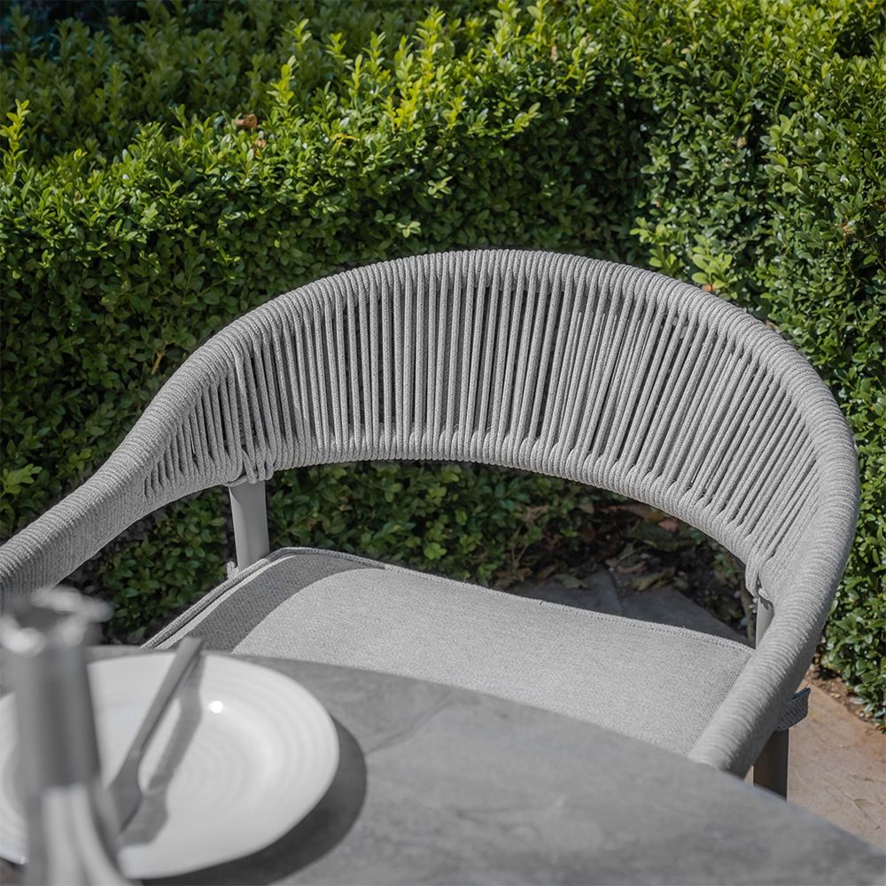 Transform your outdoor dining experience with the Maze Florence Rope Weave 4 Seat Round Dining Set. This elegant set features a beautifully crafted ceramic oval table adorned with a 50cm removable Lazy Susan, making sharing meals effortless and enjoyable. Each of the four chairs is designed with natural linen cushions made from polyester, and a modern waterproof rope weave providing both comfort, durability and style. The piped edge gives this versatile cushion a sophisticated finish. The rope weave design and natural tones create a warm, inviting atmosphere, perfect for everything from casual brunches to intimate dinners.