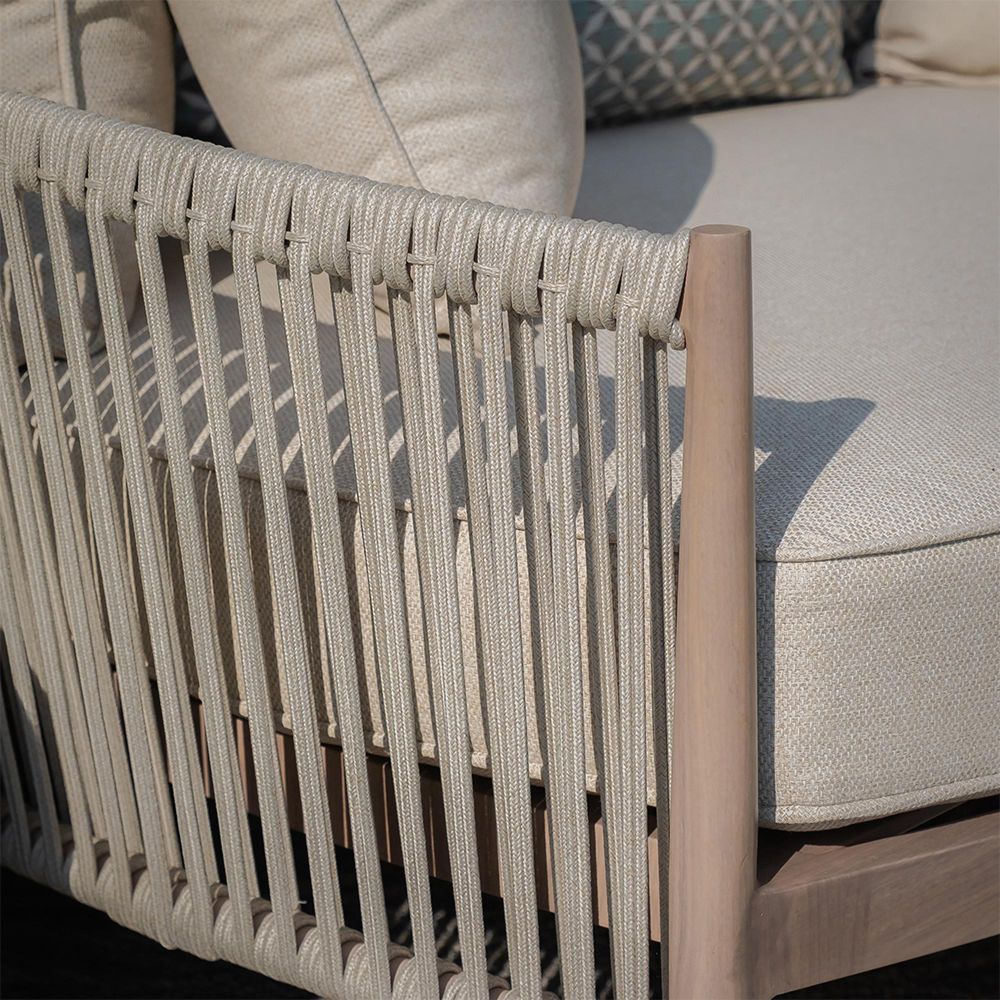 The aluminium framework is sealed with a heat transferred wrap to perfectly replicate a traditional wood appearance, allowing you to have the elegance of wooden furniture without the need to maintain it. The intricately woven polypropylene rope detail surrounds the robust framework allowing the furniture to be left outside all year round, paired with our high performance cushions which are stain, water, and fade-resistant. The plump seat and back cushions in a natural linen colour are perfectly matched the wood look framework and cream-coloured rope, exuding a natural warmth.