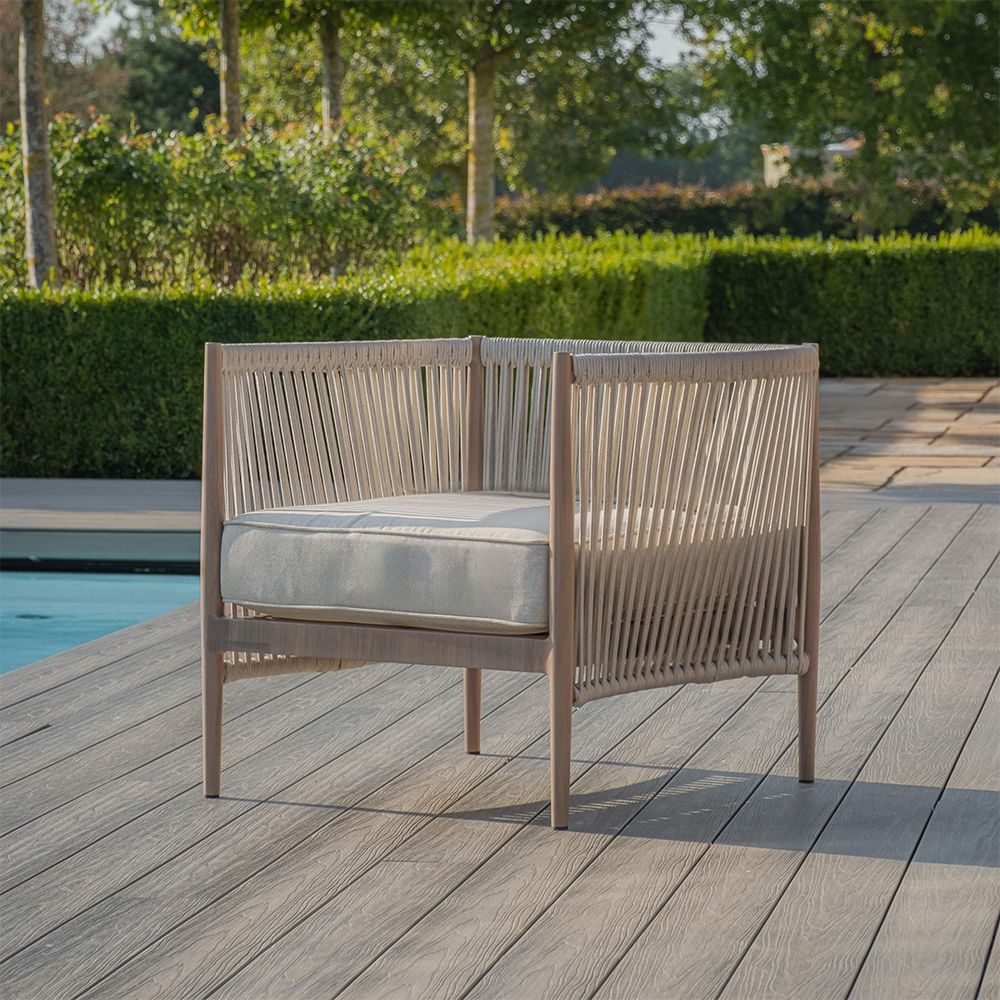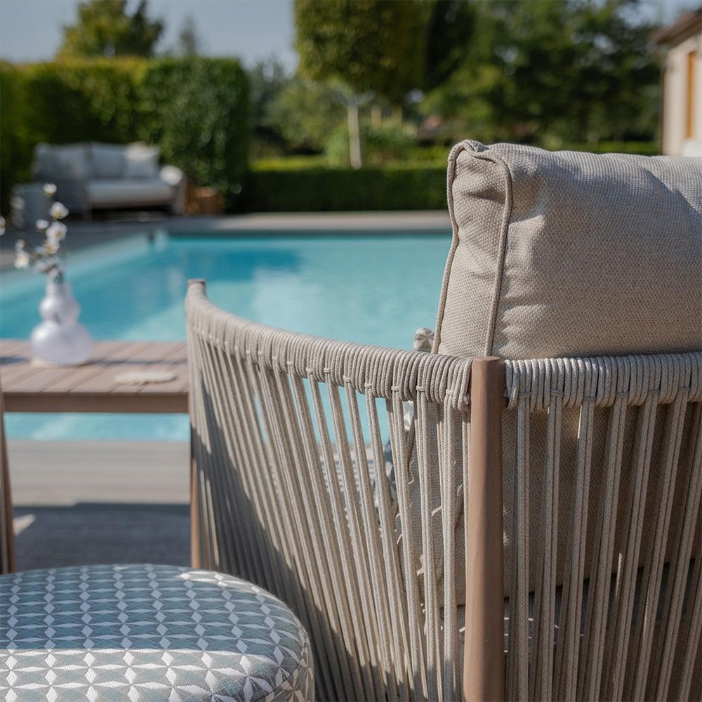The aluminium framework is sealed with a heat transferred wrap to perfectly replicate a traditional wood appearance, allowing you to have the elegance of wooden furniture without the need to maintain it. The intricately woven polypropylene rope detail surrounds the robust framework allowing the furniture to be left outside all year round, paired with our high performance cushions which are stain, water, and fade-resistant. The plump seat and back cushions in a natural linen colour are perfectly matched the wood look framework and cream-coloured rope, exuding a natural warmth.