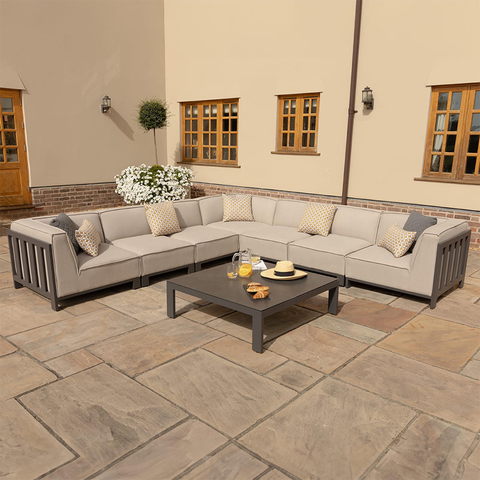 The Maze Ibiza Large Corner Sofa Set is a luxurious, modular outdoor seating arrangement designed to enhance your outdoor living space. Finished in an elegant two-tone zinc grey outdoor fabric, this set exudes modern sophistication while offering exceptional comfort. Its modular design allows for flexible seating configurations, making it perfect for hosting gatherings or simply lounging in style.