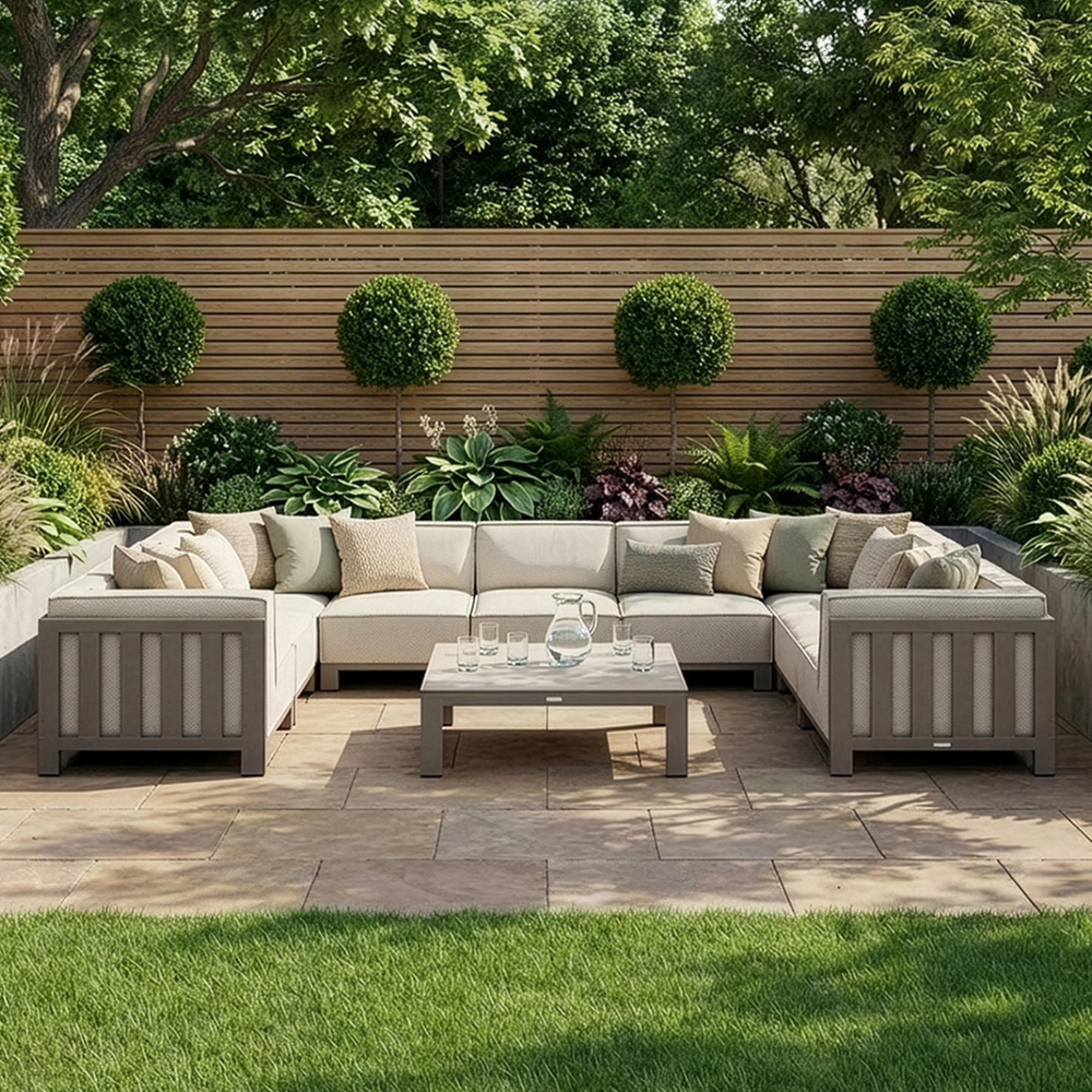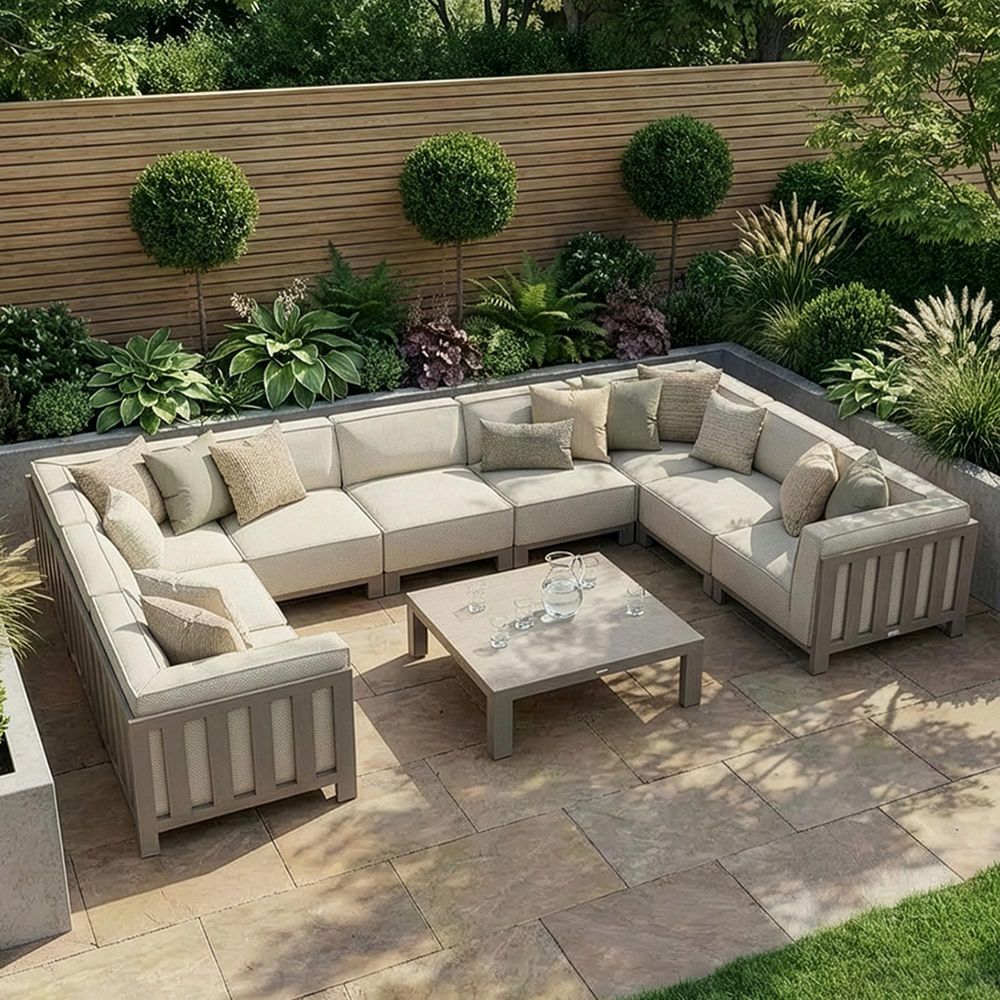 The Maze Ibiza U-Shape Sofa Set is a versatile and stylish modular seating arrangement, perfect for enhancing your outdoor living space. Finished in a chic oatmeal outdoor fabric, this set combines modern design with luxurious comfort. Its modular configuration allows you to create a wide range of seating setups using the corner and centre pieces, making it adaptable to any garden or patio layout.