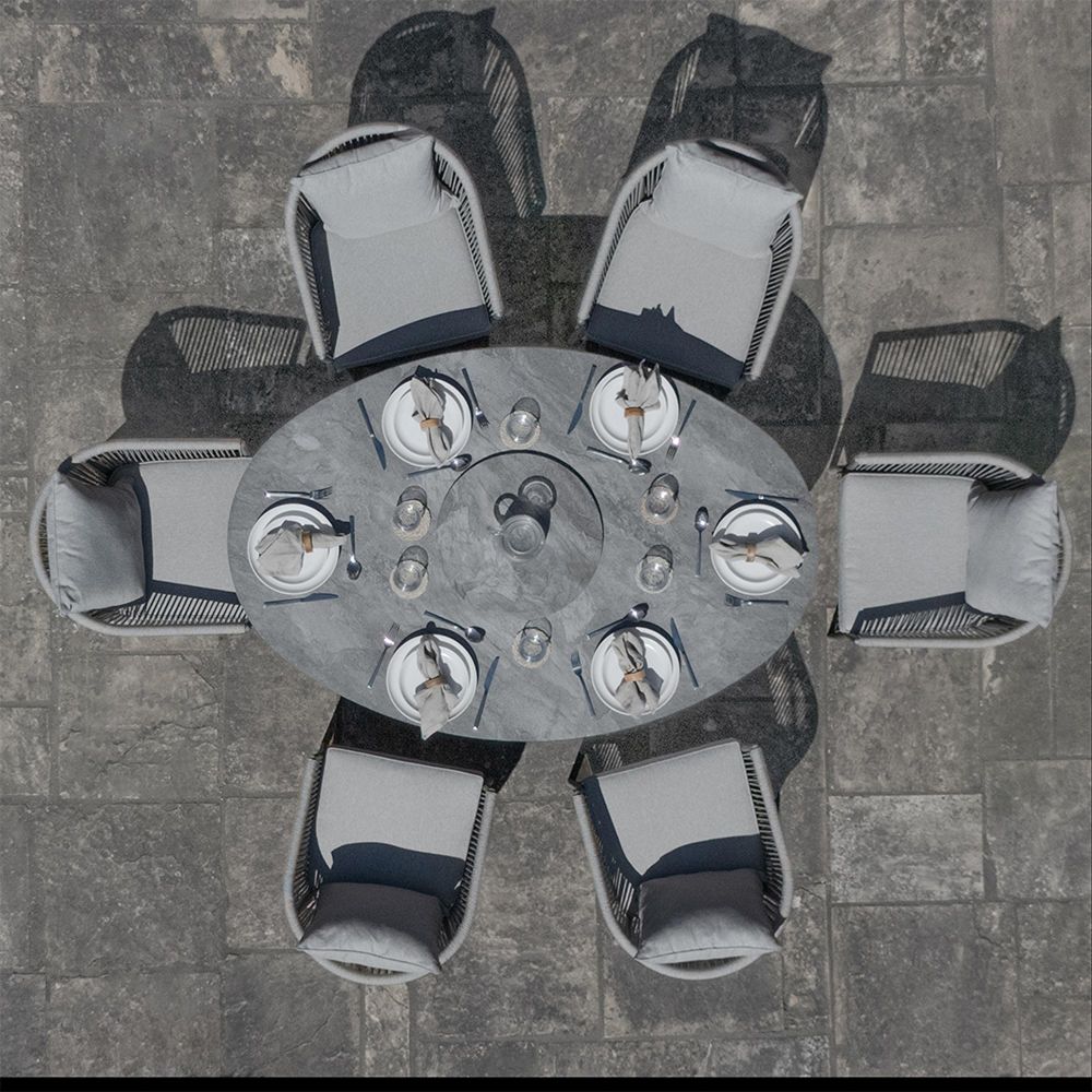 The sturdy dawn grey aluminium frames are rust-resistant and built to endure, offering durability without compromising style. At the heart of the set is an elegant oval dining table with a stunning marble-effect surface, combining the beauty of marble with easy maintenance and durability. For added functionality, the table includes a removable Lazy Susan, making it easier to serve and share dishes during larger gatherings. Perfect for family dinners or social events, the Maze Maldives 6-Seat Oval Dining Set brings a refined yet relaxed vibe to any outdoor setting.