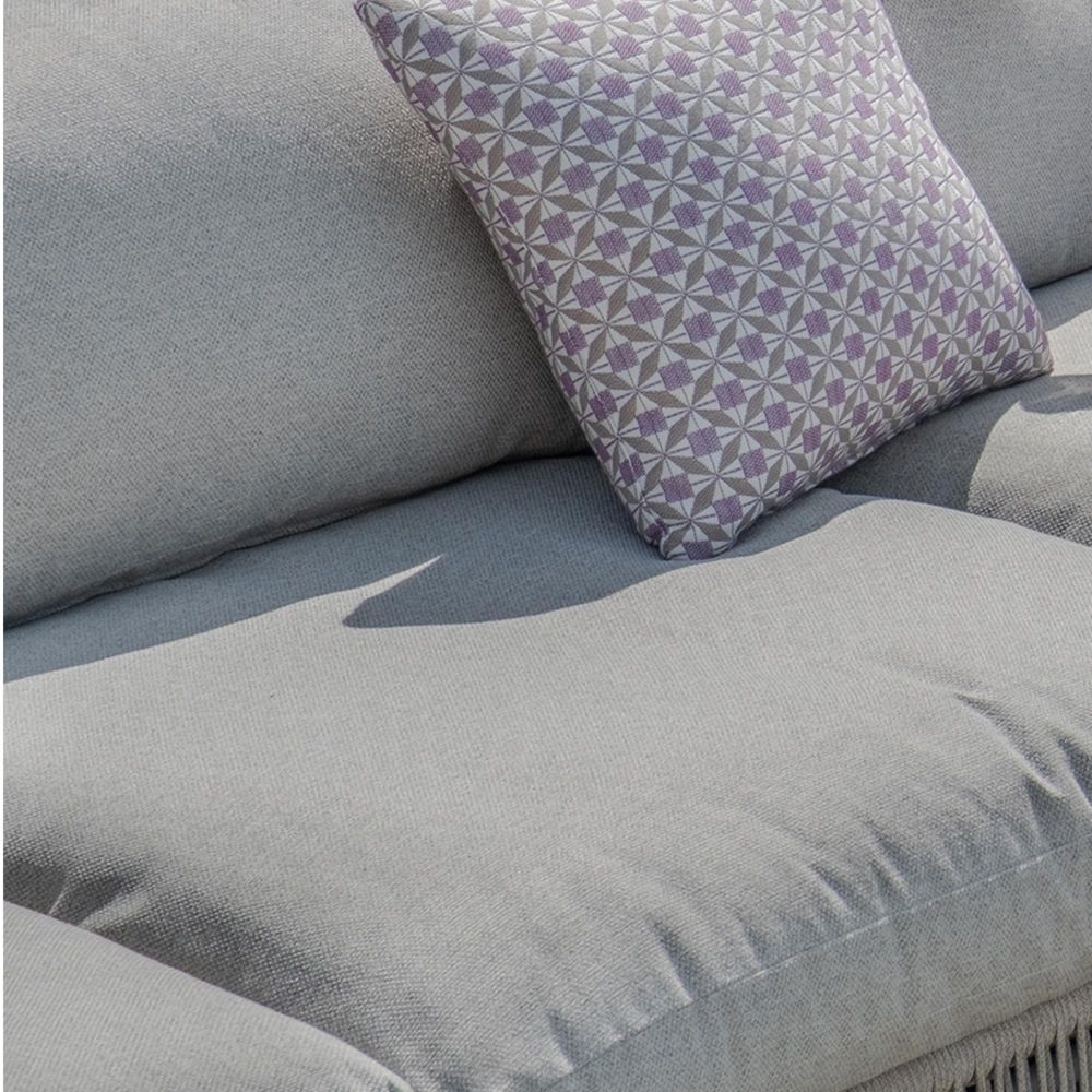 Each section is topped with soft, inviting seat cushions, providing the ultimate comfort for relaxing outdoors. The durable dawn grey aluminium frames ensure longevity, while the cool grey with a hint of beige woven into the cushions bring a cosy, relaxed vibe. The set also includes a stylish square coffee table, finished with the same elegant rope detailing and a luxurious marble-effect ceramic glass table top, adding a touch of sophistication and functionality to your outdoor space.