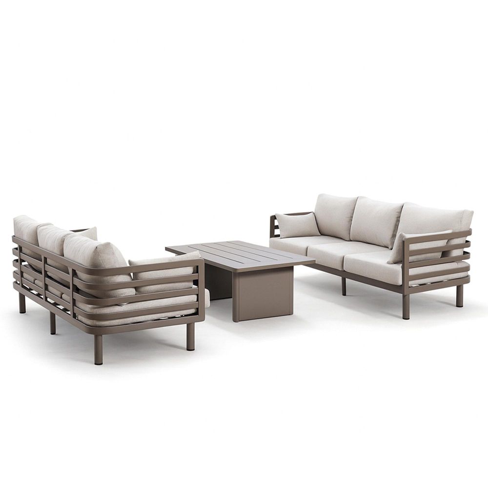 Transform your outdoor living space with the Maze Metro Aluminium 3-Seat Sofa Set in Caf?, a sleek and modern lounge collection designed for both style and long-lasting durability. Crafted from powder-coated aluminium, the streamlined frame delivers a clean, architectural look while remaining lightweight, rust-resistant, and perfectly suited to year-round outdoor use. The centrepiece of this stunning set is the Rectangular Coffee Table, finished with a premium sintered stone tabletop. This durable, refined surface offers exceptional resistance to heat, scratches, and stains?making it both practical for everyday use and elegant enough for stylish outdoor entertaining. Paired with the Caf? aluminium frame are luxurious almond-coloured cushions, adding warmth and contemporary contrast. Deep-filled and supportive, these cushions provide exceptional comfort while being crafted from high-performance outdoor fabric that resists fading and dries quickly.