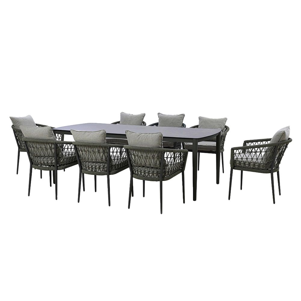 At the heart of the set is a rectangular table with tempered glass table-top featuring a refined design of marble ceramic nestled between eight comfortable dining chairs. The robust powder coated aluminium framework intricately wrapped in woven all weather rope that can be left outside all year round whatever the weather. In addition we have a matching lazy susan in the centre of the table to allow you to share food or condiments with ease.