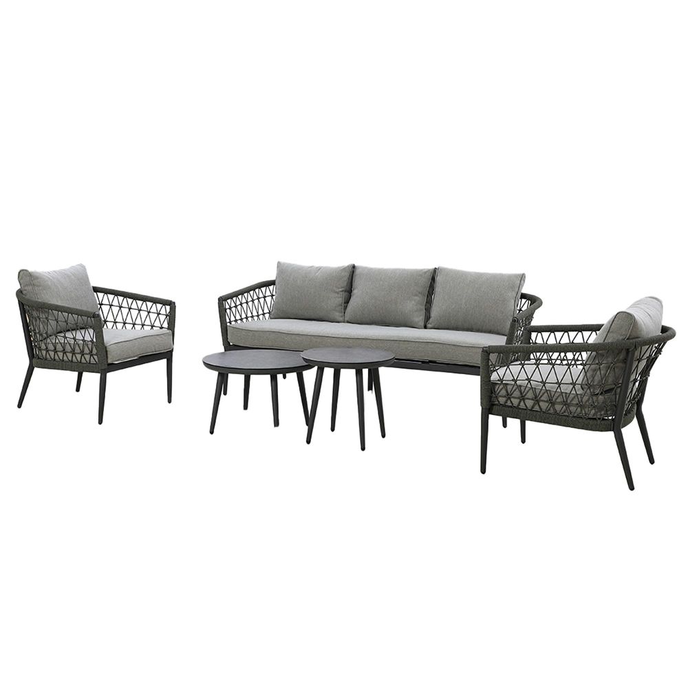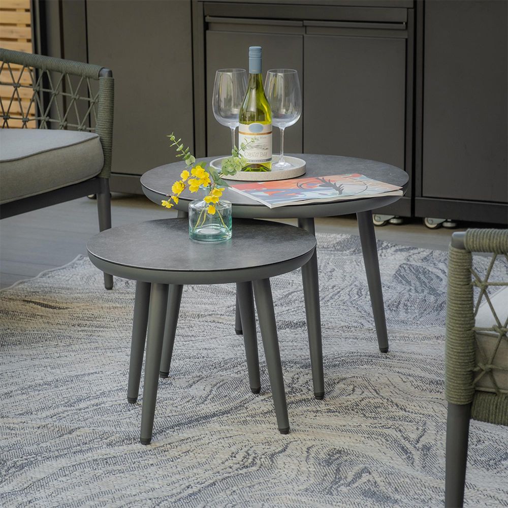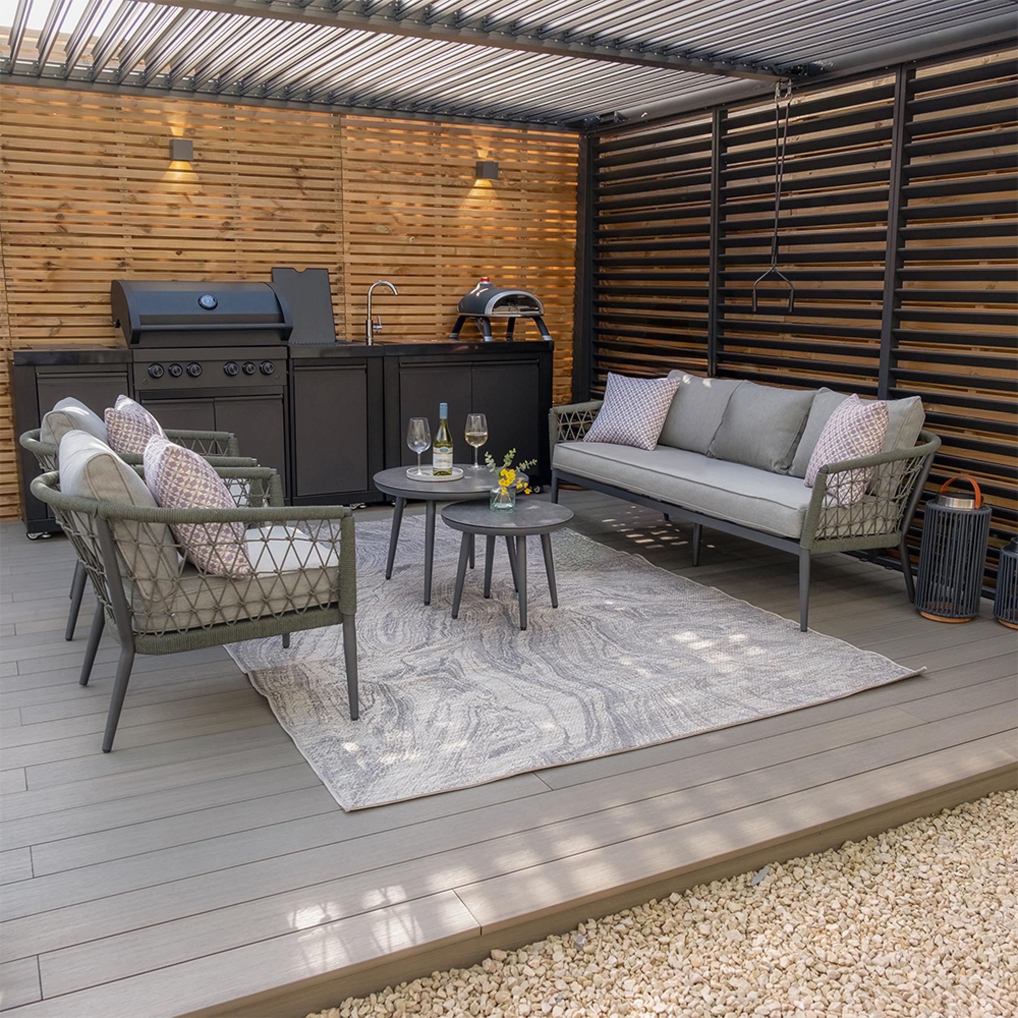 Elevate your outdoor space into a luxurious haven with the Maze Monaco 3 Seat Sofa Set with Pair of Round Coffee Tables and 2 Armchairs. This 3 seat sofa complete with two individual armchairs, and contemporary round nesting tables seamlessly suits any indoor or exterior setting whether that?s an orangery, conservatory, or modern garden room.