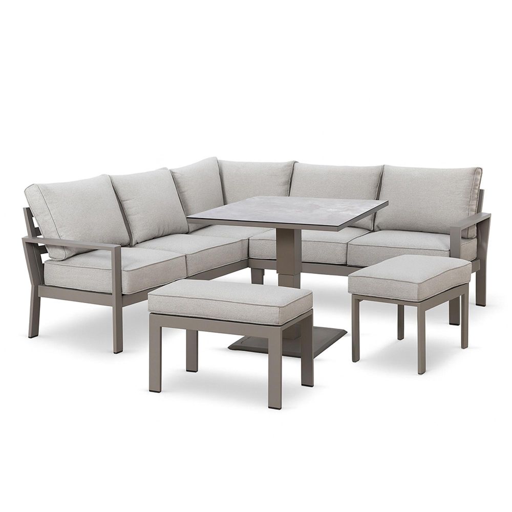 The Maze Montreal Small Corner Dining Set brings a touch of style and practicality to smaller garden spaces. Its powder-coated aluminium frame is strong, lightweight, and weather-resistant. The set features a left-hand garden sofa, a right-hand garden sofa, two garden stools, and a square, hydraulic-rising table, offering flexible options for garden dining or relaxation. The cushions are made with SeasonSure fabric, which is shower-resistant and suitable for light rain. The tempered ceramic glass tabletop is durable and easy to clean. A winter cover is available separately for added protection during colder months.
