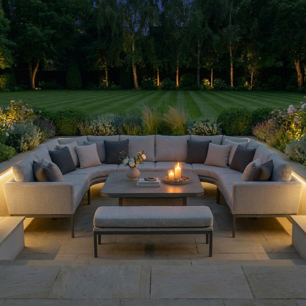 Item Code: FB-PUL-USD-LAT Our largest and most powerful set of the Pulse Collection, this beautifully crafted U-Shaped Sofa Set is perfect for socialisation and maximum comfort. The sofa includes an extra bench to bring everyone together, the rising table can be set for dining or coffee which is easily adjustable for transforming your garden space and creating the perfect setting. Made from our high performance outdoor fabric, the question asks how do I store such a large sofa set the amazing feature of this fabric is that it is designed for you to be able to leave the set outside all year round. After the winter months pass, a quick hand or jet wash will bring your set back to brand new ready for the warmer season.Set Includes