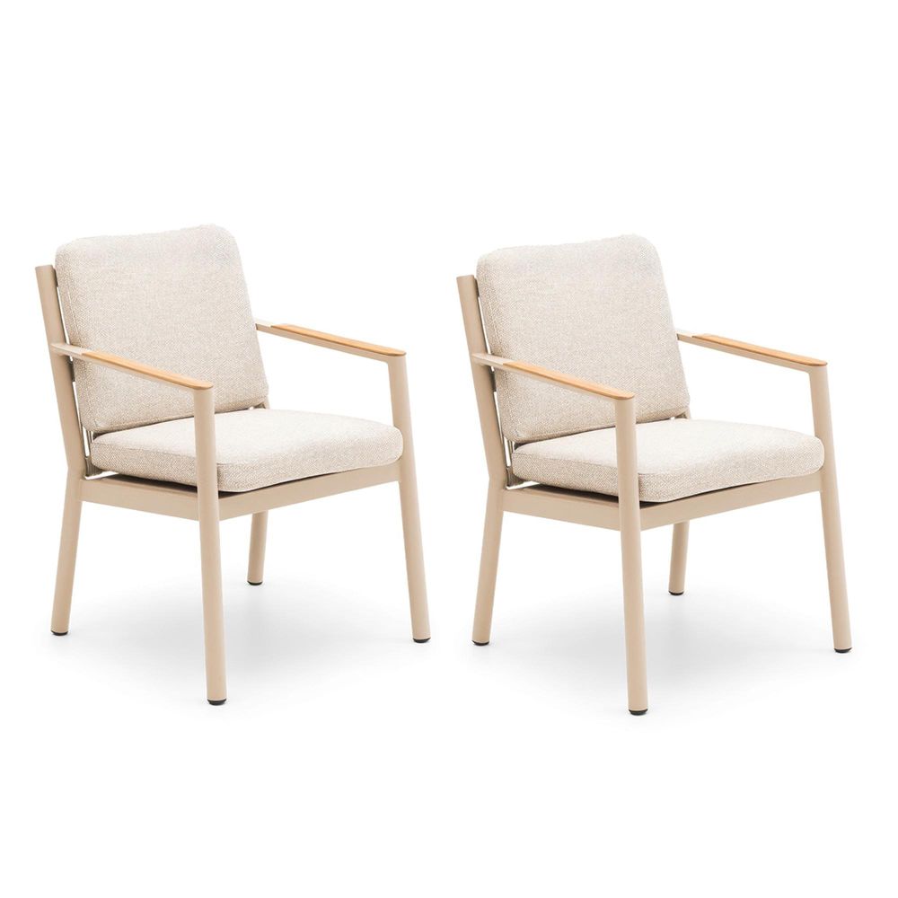 Dine in style and comfort with the new-for Maze Sicily Rope Weave Dining Chairs in Latte, a sophisticated seating option that brings contemporary elegance and timeless craftsmanship to any outdoor setting. Perfect as an addition to your dining arrangement or as standalone accent chairs, this beautifully designed pair enhances patios, gardens, and terraces with effortless style. Expertly built with a solid natural FSC-certified teak wood and a powder-coated aluminium frame, each chair offers outstanding strength, durability, and weather resistance. The intricately woven polyester rope detailing creates a refined modern look, while the plush Sunproof? fabric cushions deliver superior comfort for long, leisurely meals. Designed with practicality in mind, the cushions are both shower-resistant and stain-resistant, ensuring they stay fresh and inviting throughout the seasons. Combining premium materials, contemporary styling, and exceptional comfort, this pair of Sicily Rope Weave Dining Chairs is the perfect choice for elevating your outdoor dining experience. Whether used for casual alfresco meals, relaxed brunches, or evening gatherings under the stars, these elegant chairs bring comfort and sophistication to every occasion.