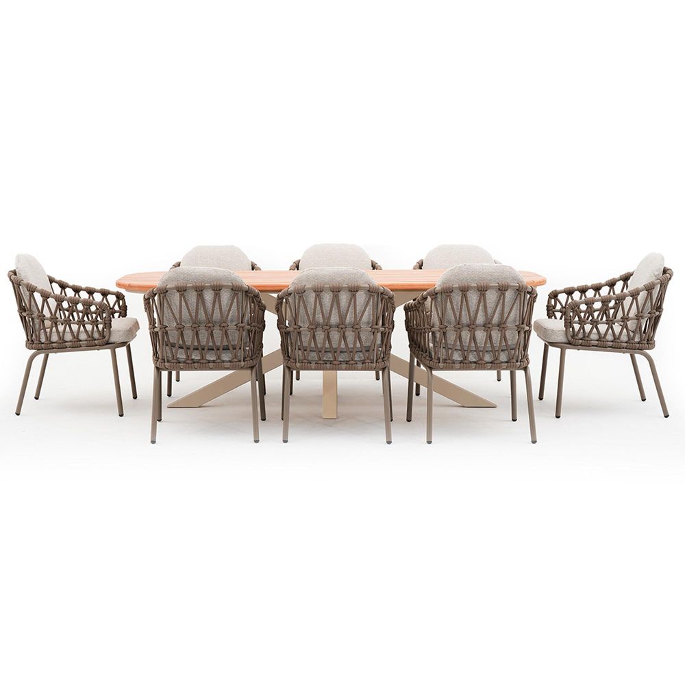 Elevate your outdoor dining experience with the Maze Sicily 8-Seater Rectangular Dining Set. Designed for effortless alfresco entertaining, comfortably seating eight people. The generously sized rectangular table is built with a solid FSC certified Teak on the Table Top and a durable powder-coated aluminium cafe-style frame, which included adjustable feet on the table, providing both strength and timeless appeal. The coordinating open rope weave chairs, handwoven from high-quality polyester rope in a soft Latte tone, featuring Season Sure plush shower- and stain-resistant cushions for lasting comfort and low-maintenance luxury. Perfectly crafted for modern outdoor living, this 8 seater Dining Set set offers a stylish and practical solution for memorable dining and entertaining all year round.