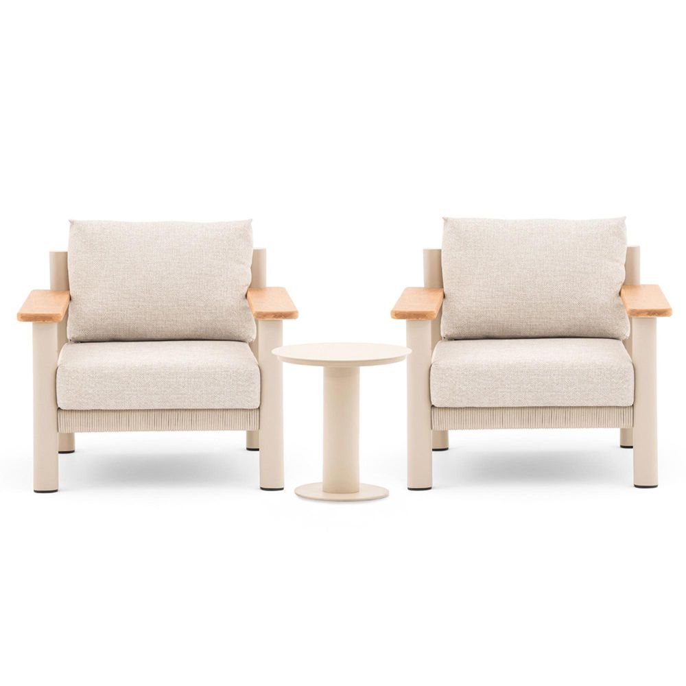 Create a relaxed and stylish outdoor retreat with the new Sicily Rope Weave Lounge Set with Round Side Table in Latte, a beautifully designed collection that blends contemporary elegance with luxurious comfort. Adjustable feet ensures perfection for patios, balconies, garden rooms, or cosy corners of your outdoor space, this compact yet sophisticated set is ideal for enjoying morning coffee, afternoon reading, or evening drinks in style. Expertly crafted with a solid natural FSC-certified teak wood armrests and a powder-coated aluminium structure, the Sicily collection is built to offer exceptional durability and timeless appeal. The polyester rope weave detailing adds a refined, modern look, while the plush polyester cushions ensure superior comfort and support. Designed for real outdoor living, the cushions are both shower-resistant and stain-resistant, making them low-maintenance and long-lasting throughout the seasons. This elegant lounge set includes two generously sized armchairs that provide a perfect balance of support and relaxation, paired with a sleek round pedestal aluminium side table the ideal companion for drinks, snacks, or decorative touches. Its versatile design makes it suitable for both standalone lounging areas or as a stylish addition to larger outdoor seating arrangements. With no assembly required, you can enjoy this set straight out of the box, and a 2-year warranty gives you complete peace of mind. Combining premium craftsmanship, contemporary design, and everyday practicality, the Sicily Rope Weave Lounge Set with Side Table is a timeless choice for elevating your outdoor living experience.