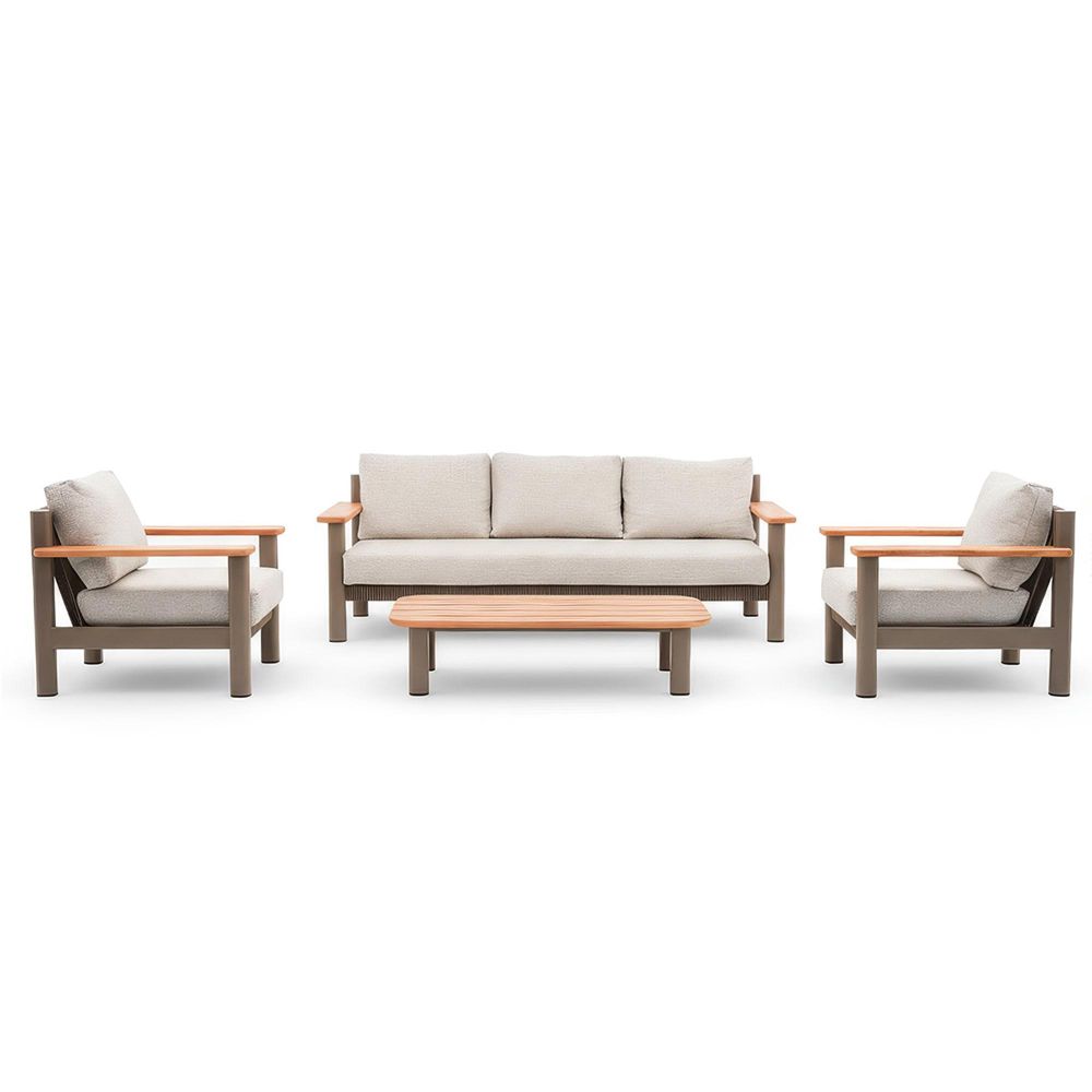 Introducing the Maze Sicily Rope Weave 3 Seat Sofa with 2 Armchairs & Coffee Table in Latte, This exquisite furniture set effortlessly blends modern design with outstanding comfort and precision. Perfect for both indoor and outdoor settings, it transforms your patio, terrace, or garden room into an inviting sanctuary ideal for relaxing or entertaining in style. Expertly manufactured using a solid, natural FSC-certified teak wood on the Table Top and a powder-coated aluminium frame, which includeds adjustable feet on both the table and sofas, the Sicily collection offers exceptional durability and timeless sophistication. The polyester rope weave in a light beige tone adds a contemporary edge, while the sumptuous polyester cushions deliver lasting comfort and support. Designed for real life, the Season Sure cushions are shower-resistant and stain-resistant, ensuring they remain beautiful and easy to maintain season after season. This spacious suite includes a three-seat sofa, two generous armchairs, and a coordinating teak coffee table, creating the perfect space for gathering with friends or unwinding. With no assembly required, you can enjoy your new retreat the moment it arrives. Balancing comfort, quality, and contemporary flair, the 3 Seat Sofa with 2 Armchairs & Coffee Table in Latte is a true statement of sophisticated outdoor living.