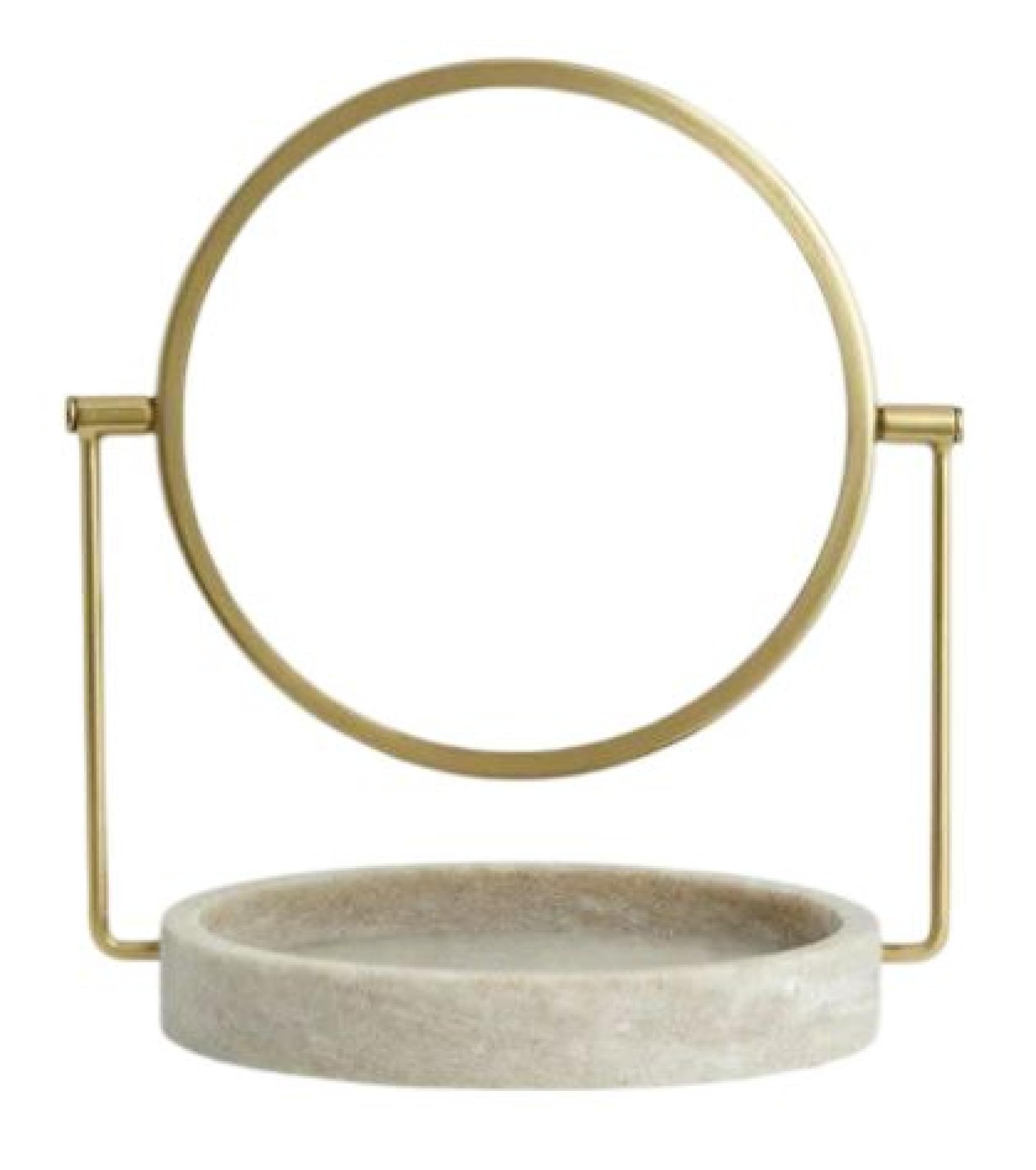 Item Code: 4155 HAJA is a table mirror with a golden edge and a small dish in light brown marble. Use it for hair pins, cosmetics, jewelry etc. The backside is with magnifying mirror glass.