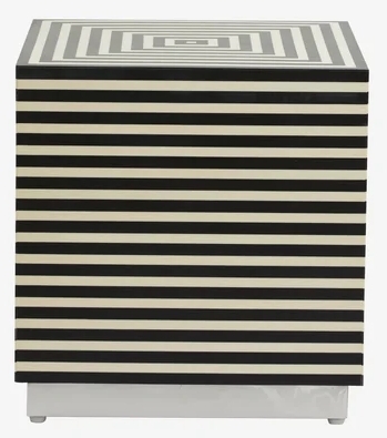 Item Code: 75101 TAURA sidetable or coffetable is a cool addition to your home decoration. Use it as a sidetable or as a stool. TAURA is a mix of resin and a board of mango wood. Black and white stripes are classic but the pattern gives your decoration a new and edgy feel. The table is available in another form and design.This is a Made to Order itemAll Made to Order items are manufactured as per the order supplied by you.We are unable to accept cancellation or accept any extra cost that may incur due to wrong information provided by you at the time you placed the order.We will confirm all sizes/colours/finishes in written email (order confirmation) with you before going ahead with production of your order.