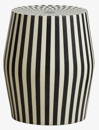 Item Code: 75100 TAURA sidetable is a cool addition to your home decoration. Use it as a sidetable or as a stool. TAURA is a mix of resin and a board of mango wood. Black and white stripes are classic but the pattern gives your decoration a new and edgy feel. The table is also available in another form and design.This is a Made to Order itemAll Made to Order items are manufactured as per the order supplied by you.We are unable to accept cancellation or accept any extra cost that may incur due to wrong information provided by you at the time you placed the order.We will confirm all sizes/colours/finishes in written email (order confirmation) with you before going ahead with production of your order.