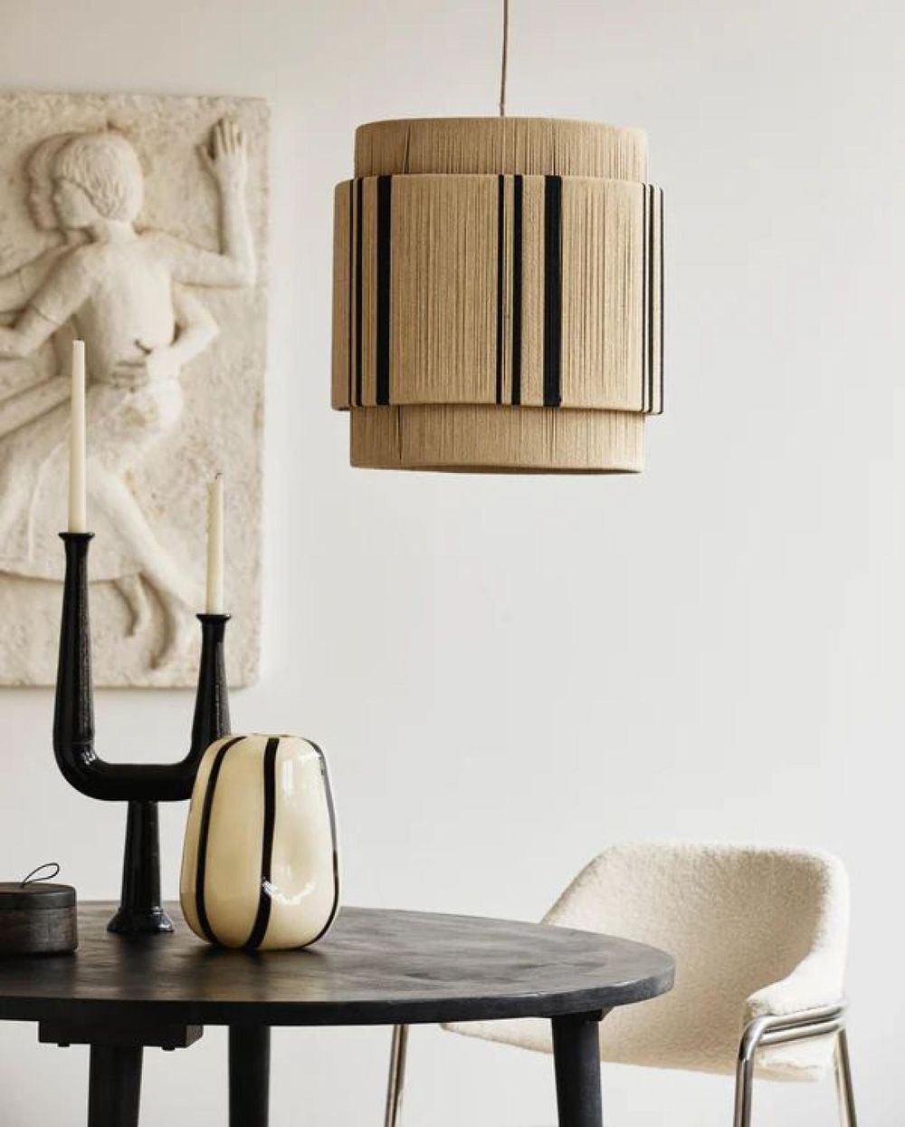 Item Code: 1020 VINATA lamp with cotton braid in a mix of beige and black. A clean and elegant lamp with a graphic, evocative design. Featuring a soft form and warm color, VINATA is a stylish lamp that will create a pleasant atmosphere in any interior. VINATA brings a comfortable ambiance to the room with its soft and focused light. Use VINATA in various places places around your home, such as for practical lighting in the hallway, or combine several VINATA lamps for a more voluminous, decorative look. The cord measures 150 cm. Light source not included. Socket size: E27 Max Watt: 40W.