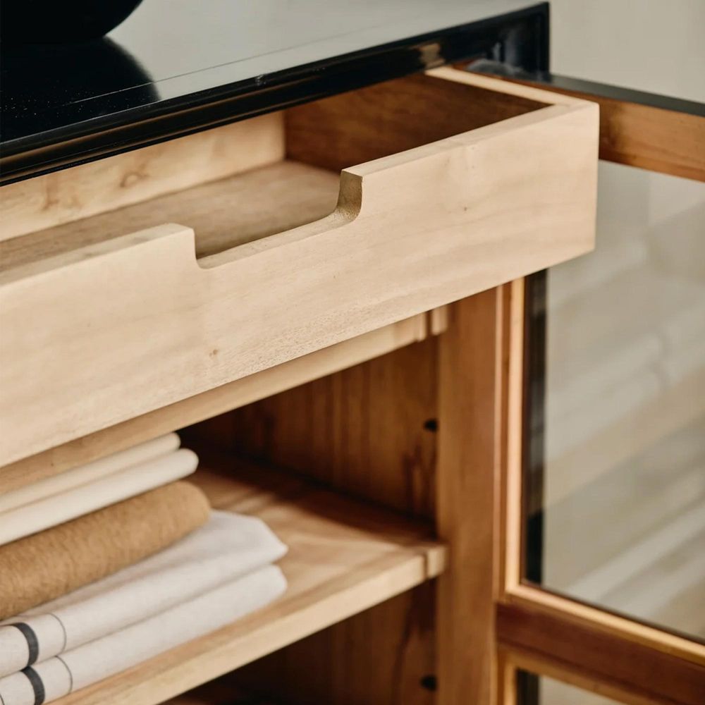 Item Code: 2046 Discover the VIVA Display Cabinet The Perfect Blend of Modern Elegance and Classic Style. Featuring two glass doors and a black frame lined with wood veneer on the inside, this cabinet elegantly showcases your favorite items in a refined and sophisticated manner. This model also functions as a low sideboard, perfect for decorating with candlesticks, ornaments, and photos, allowing you to create a personalized atmosphere in your home. The sleek black edges act as a stylish frame, highlighting the contents within. The VIVA display cabinet is versatile and functional, making it ideal for any room in your home ? whether it?s the living room, kitchen, office, or hallway. The shelves are height-adjustable to suit your specific needs. As the cabinet is made from natural materials, variations in appearance may occur.
