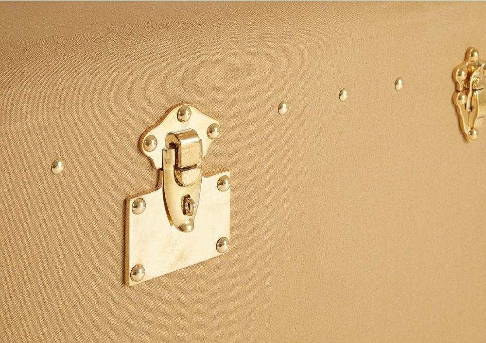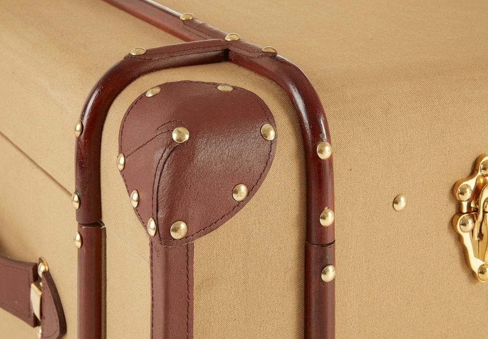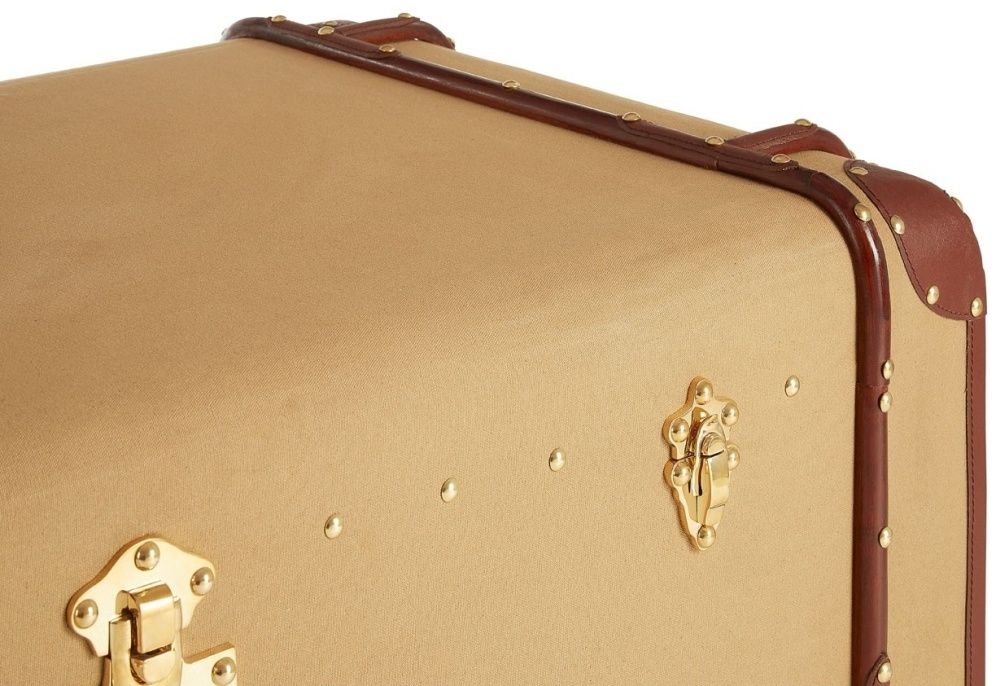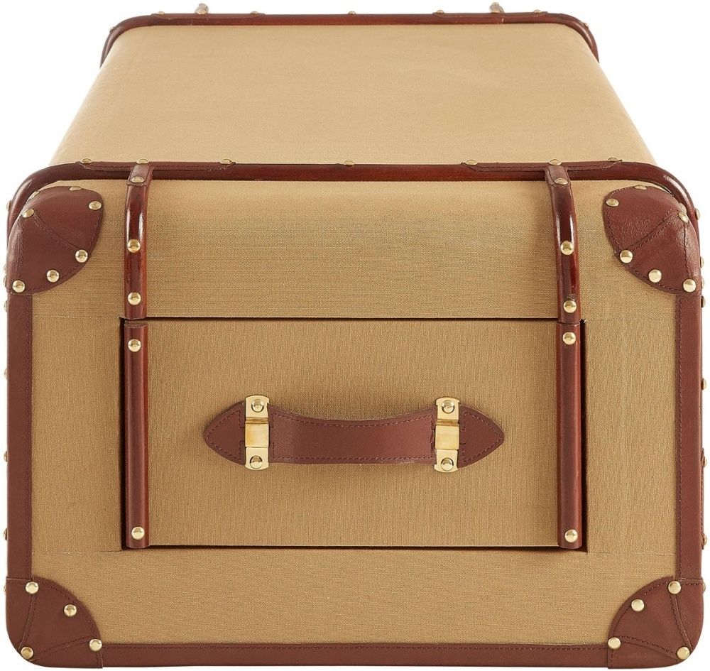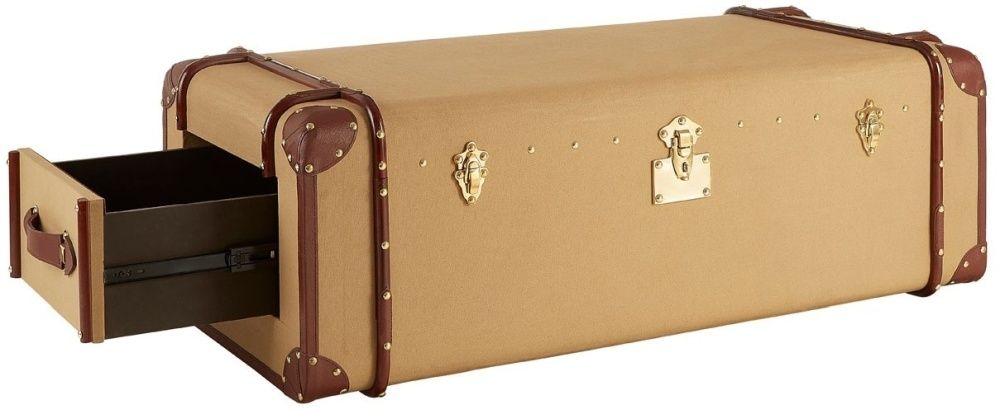 Item Code: 5501762 The Columbus coffee table evokes the glamour of vintage travel with its steamer trunk design.Its case is made from eco friendly mango wood and is covered with textured canvas. The canvas has a natural colour that complements the brown, genuine leather detail at the corners and sides. Its side drawers feature coordinating leather handles, while the stud detail complements the metal clasp locks that secure its lid.