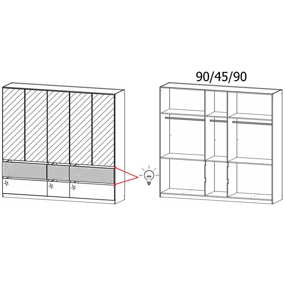 Winnipeg Wardrobe - 226cm - 5 Door - Mirror - with Lighting - High Gloss Alpine White & Halifax Oak